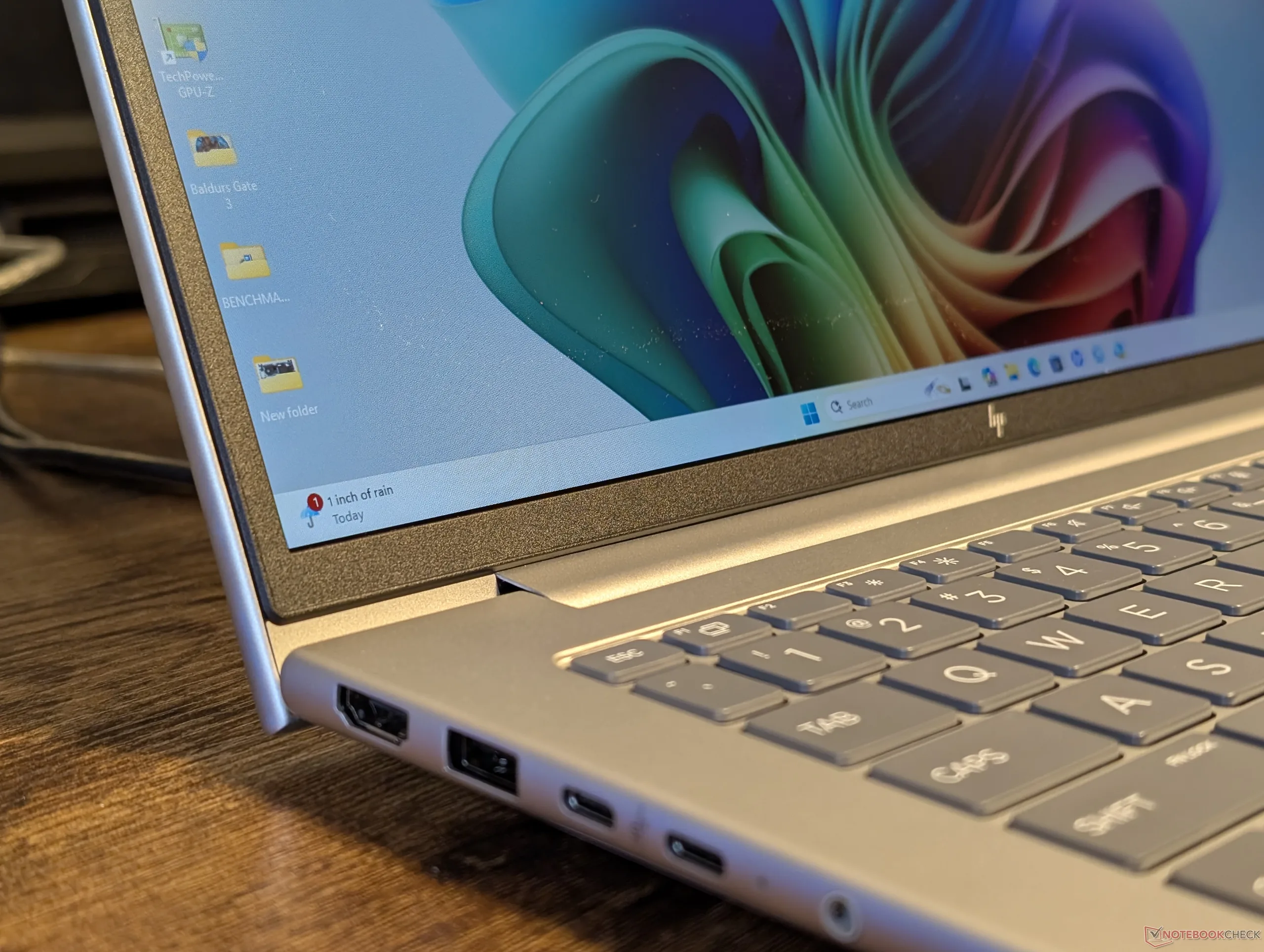Ehhez a belépő szintű EliteBook modellhez képest lenyűgöző számú integrált portot találunk. HDMI, RJ-45 és több USB-A port mind jelen van, míg a jóval drágább EliteBook Ultra G1q számos ilyen kapcsolt elem hiányzik.