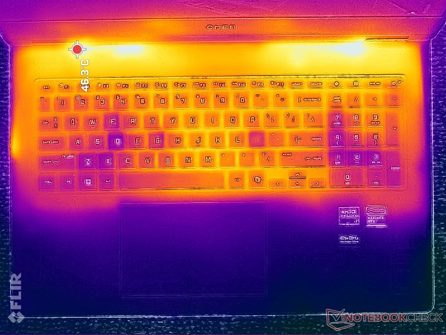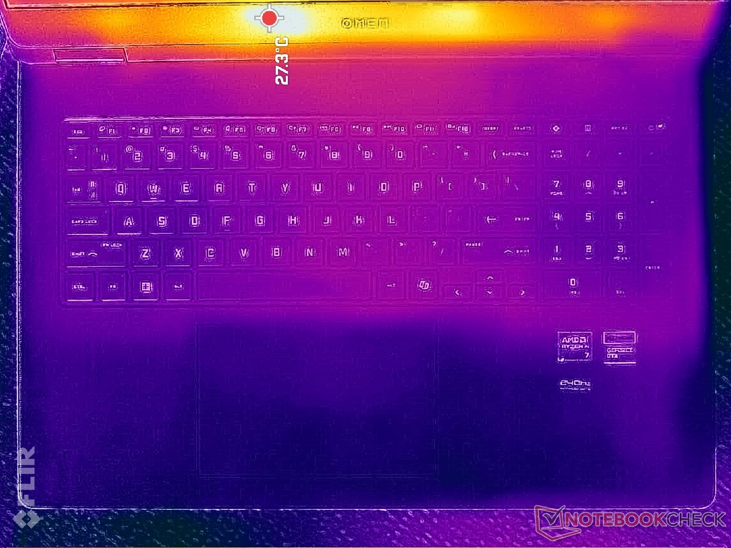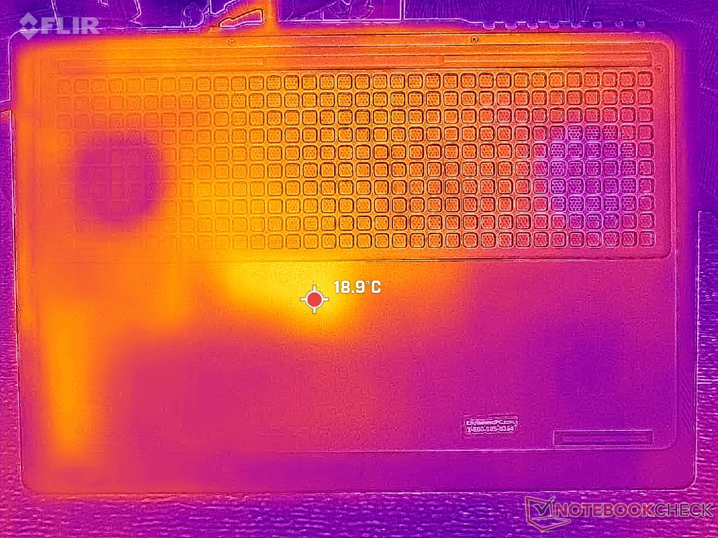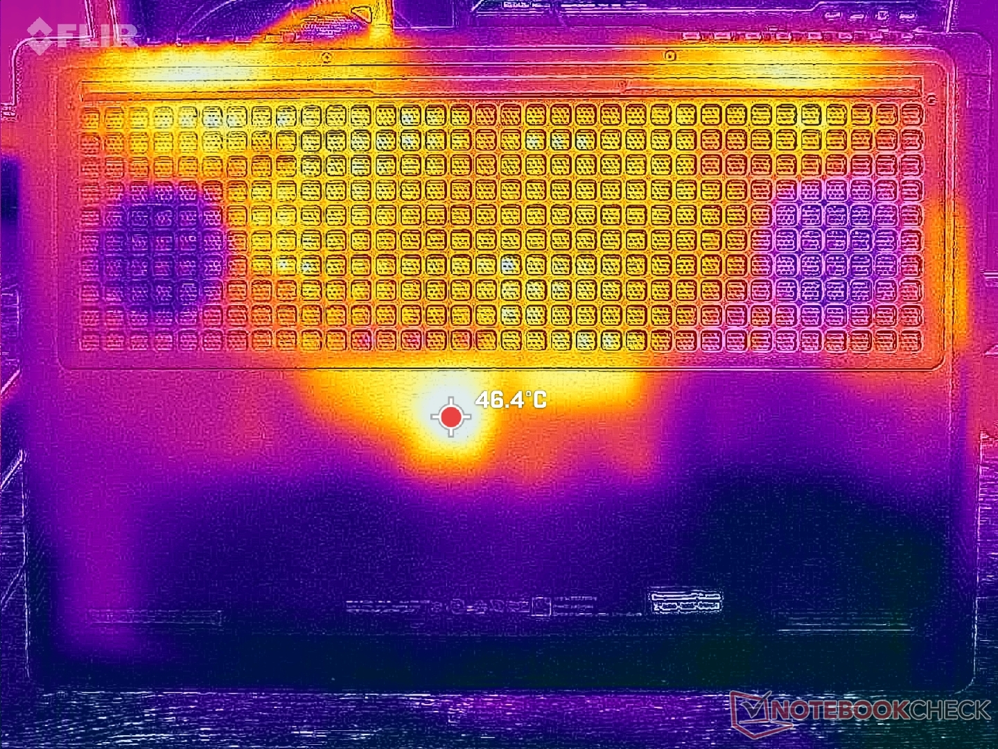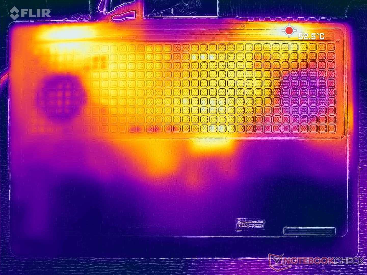 A felszíni hőmérséklet a billentyűzet közepe felé a legmelegebb, ahol a forró pontok játék közben elérhetik a 40 C-ot. Szerencsére a WASD billentyűk, a numpad és a tenyértámaszok sokkal hűvösebbek maradnak.