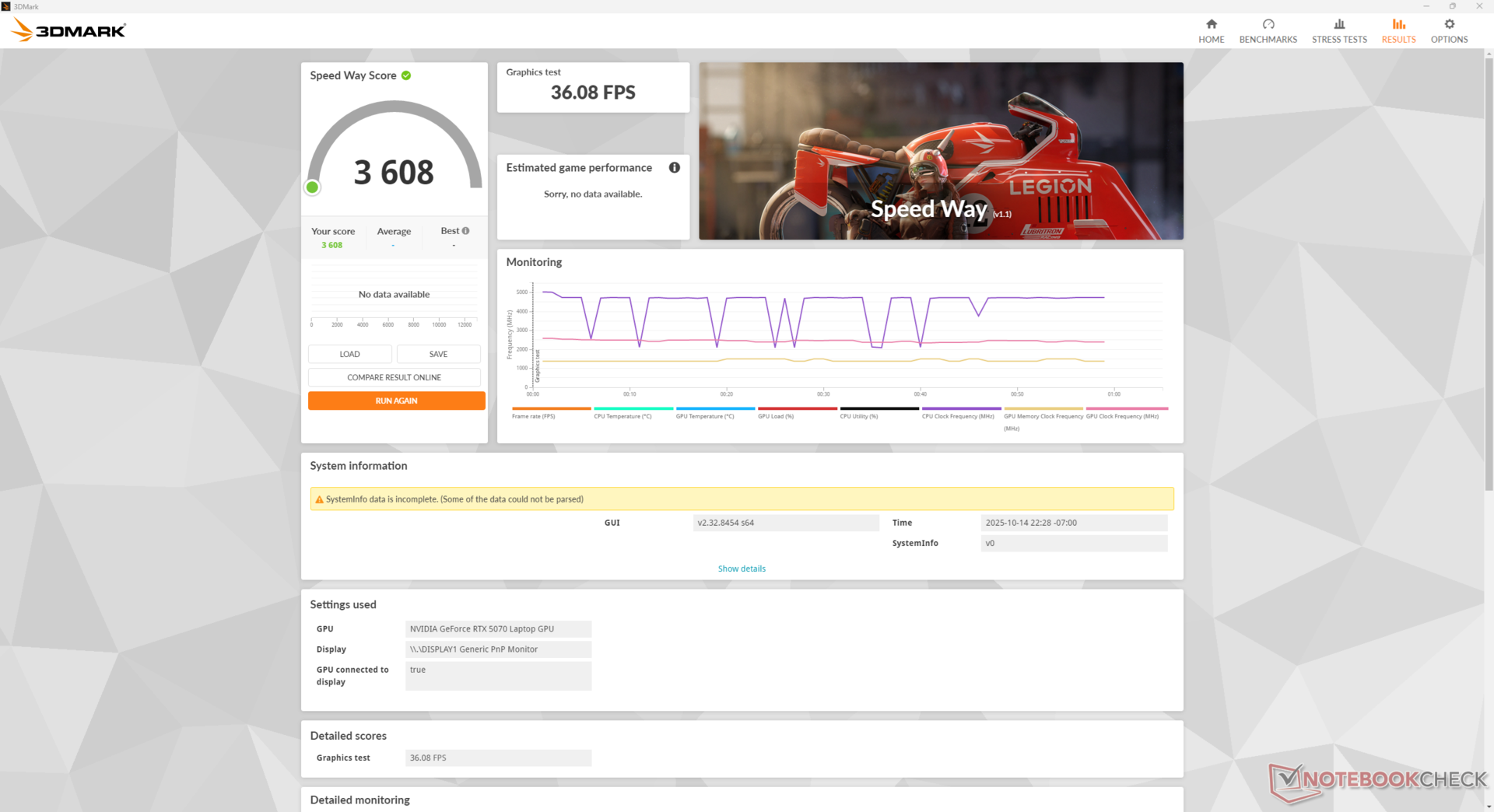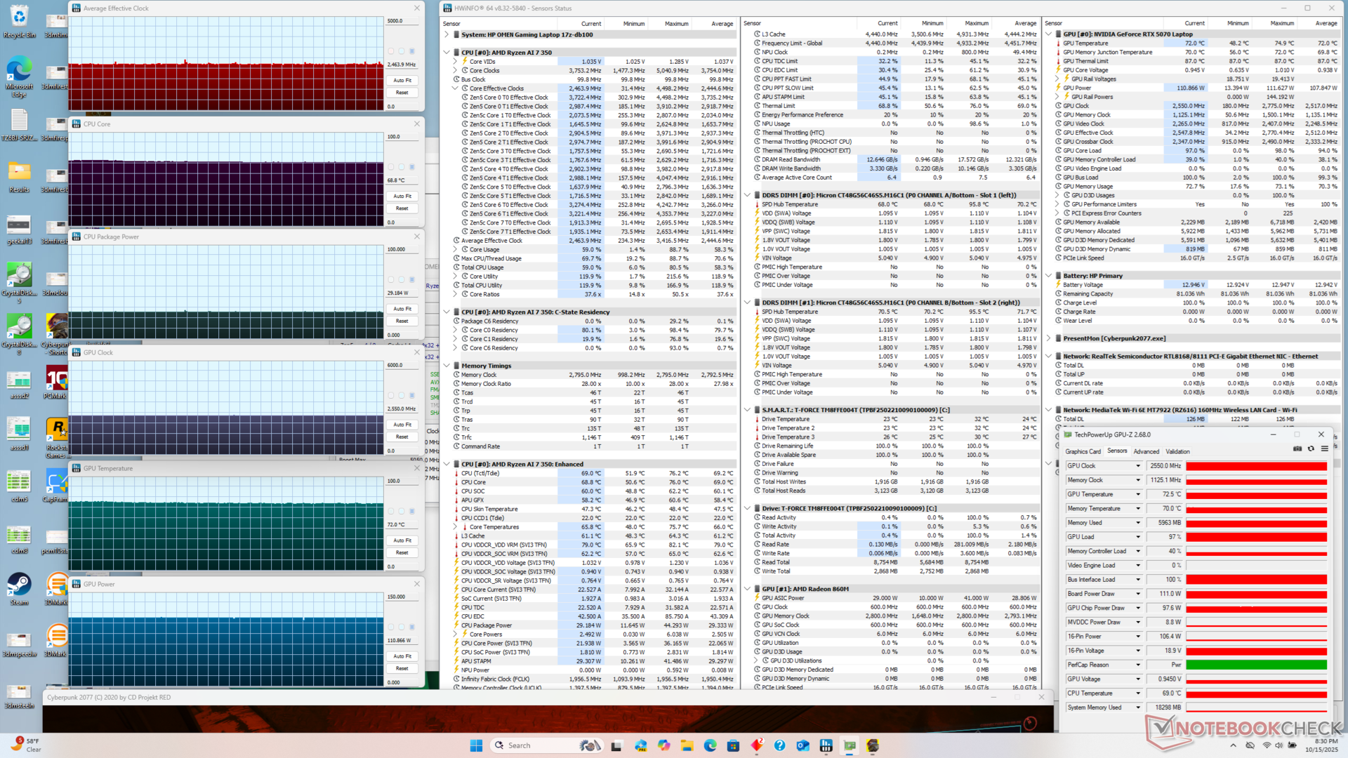 Az átlagos fogyasztási szintek terhelés alatt általában alacsonyabbak, mint amit a tavalyi modellnél mértünk, annak ellenére, hogy az újabb modellünk gyorsabb teljesítményt nyújt. A Cyberpunk 2077 futtatásakor például a 2025 Omen 17-ünk körülbelül 12 százalékkal kevesebb energiát igényel, miközben 17 százalékkal gyorsabban fut, ami jobb teljesítményt jelent wattonként. A képkockasebesség-előny még nagyobb lehet, ha a többkockás generálást használjuk, mivel a funkció nem érhető el a GeForce RTX 40-es sorozatú GPU-kon.