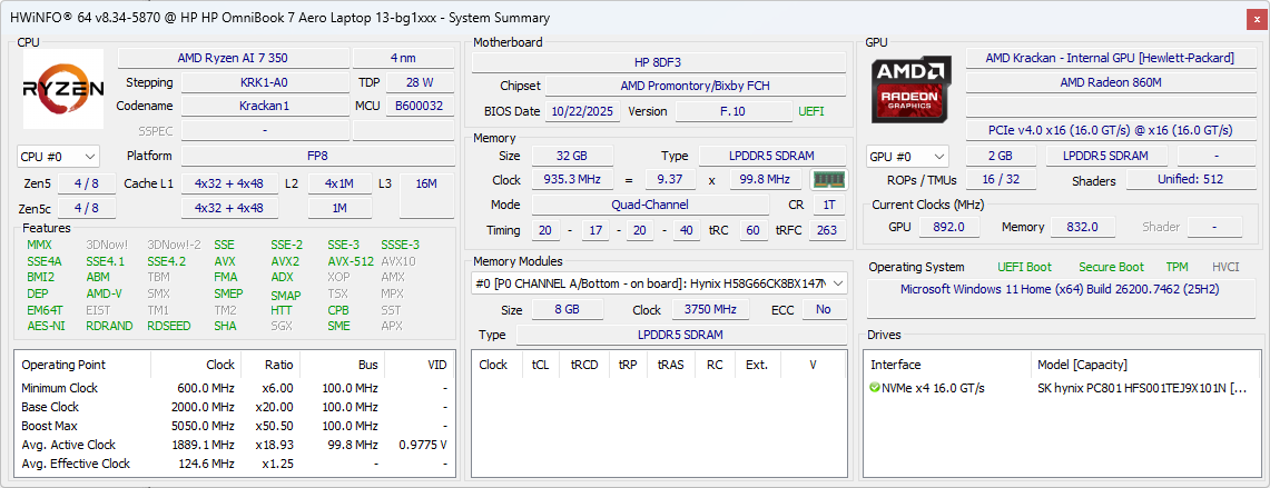 | HP OmniBook 7 Aero 13-bg1077nr AMD Ryzen AI 7 350 ⎘ AMD Radeon 860M ⎘ 32 GB Memória, 1024 GB SSD | Amazon: $529.99 List Price: 1250 USD | 1 kg | 17.6 mm | 13.30" 1920x1200 170 PPI IPS | |
