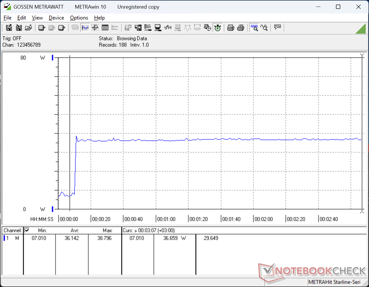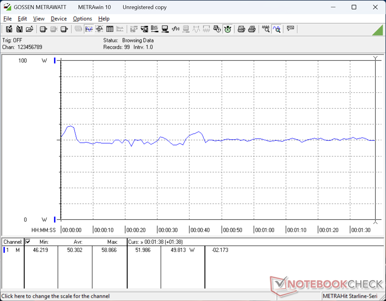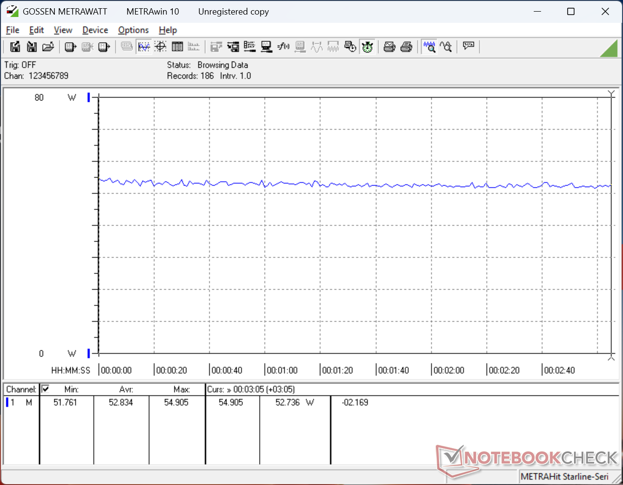 Az összfogyasztás megközelíti a Core Ultra H meghajtású MSI Summit E13 AI Evo-t, miközben gyorsabb processzorteljesítményt és hasonló grafikus teljesítményt kínál. Megjegyzendő, hogy a fogyasztás folyamatosan csökken 48 W-ról 35 W-ra, amikor a Cyberpunk 2077-en üresjáratban van, ami a teljesítmény idővel történő lassulására utal, ami kiegészíti a fenti GPU-teljesítmény szakaszban rögzített lassuló képkocka sebességet.