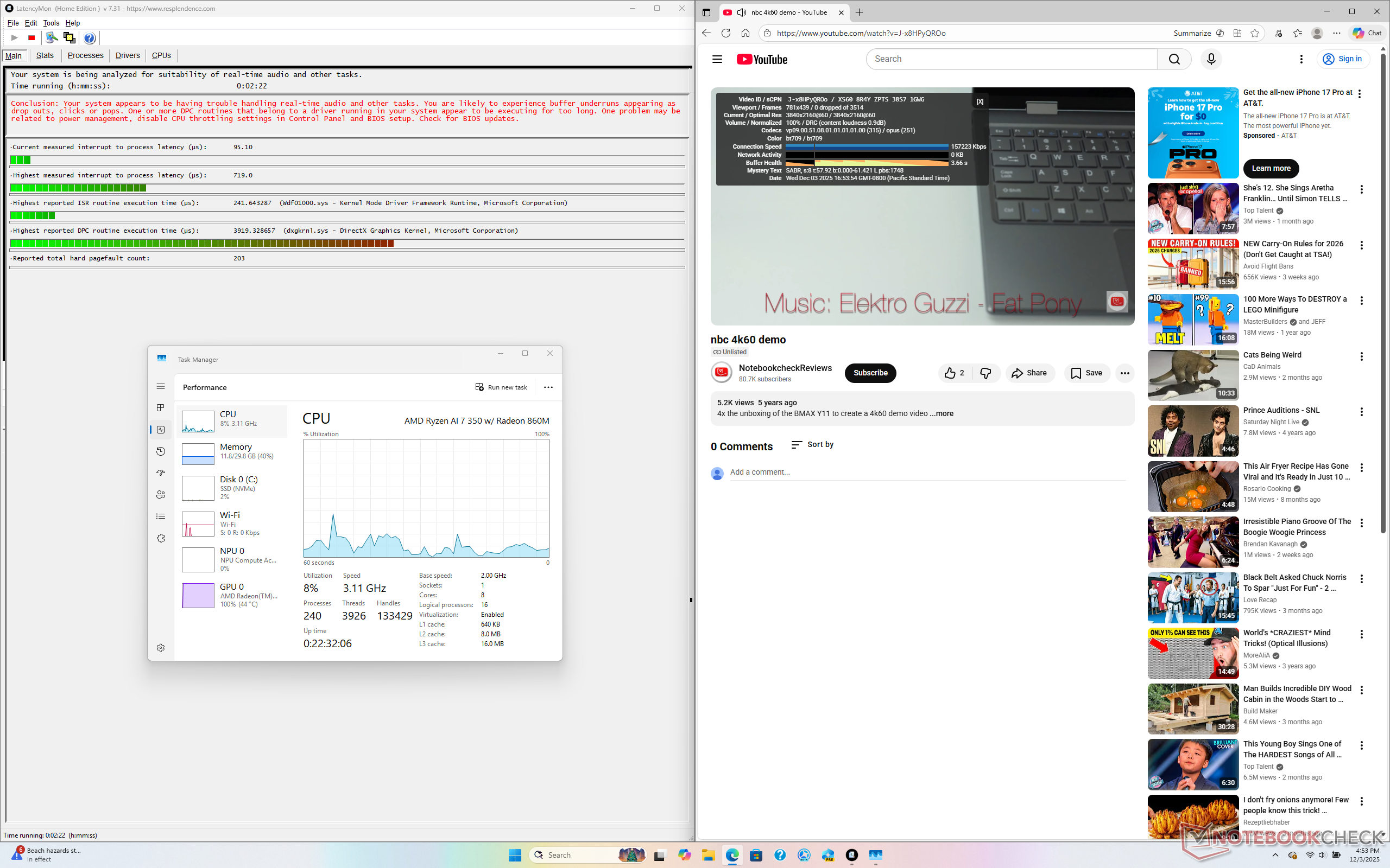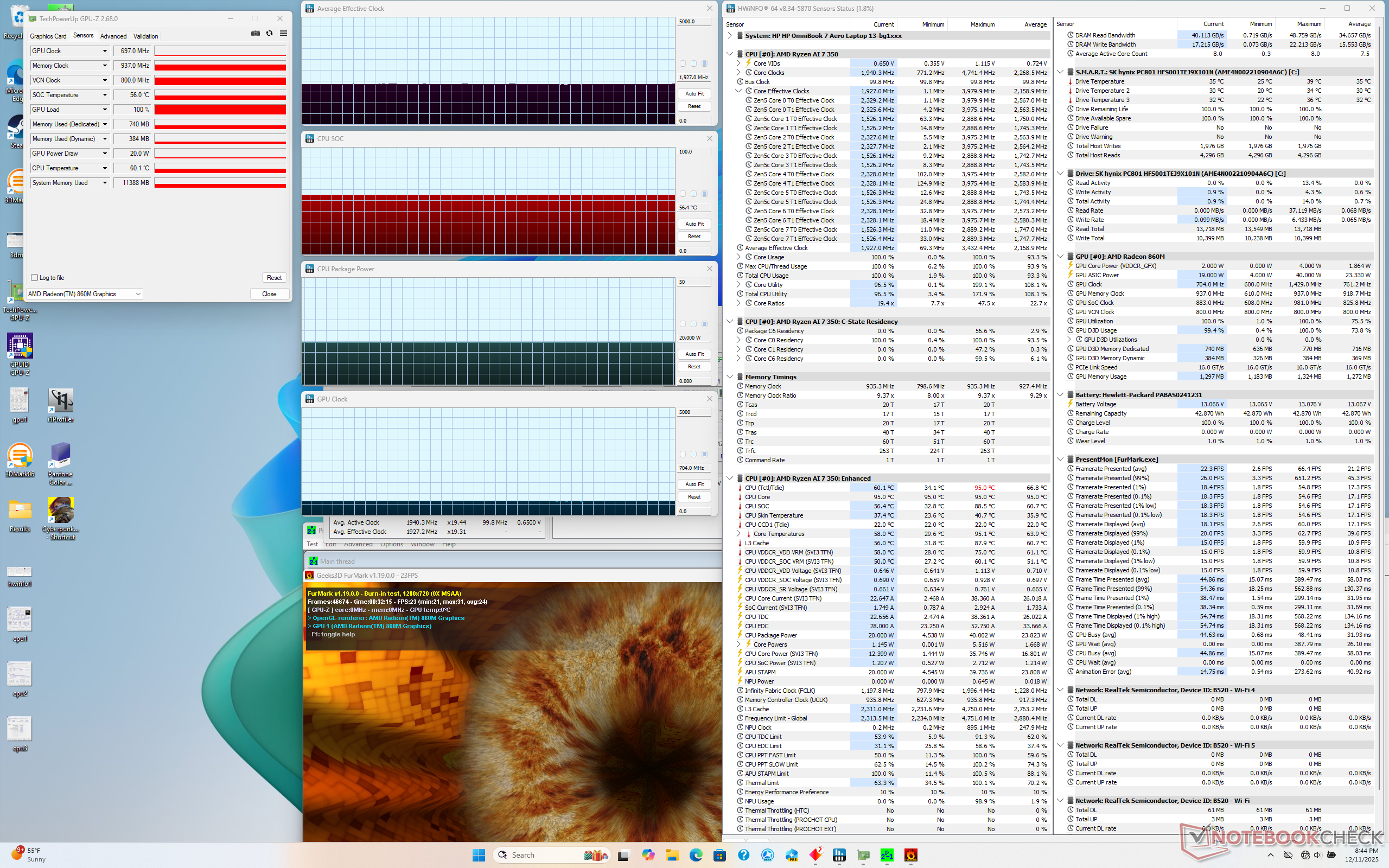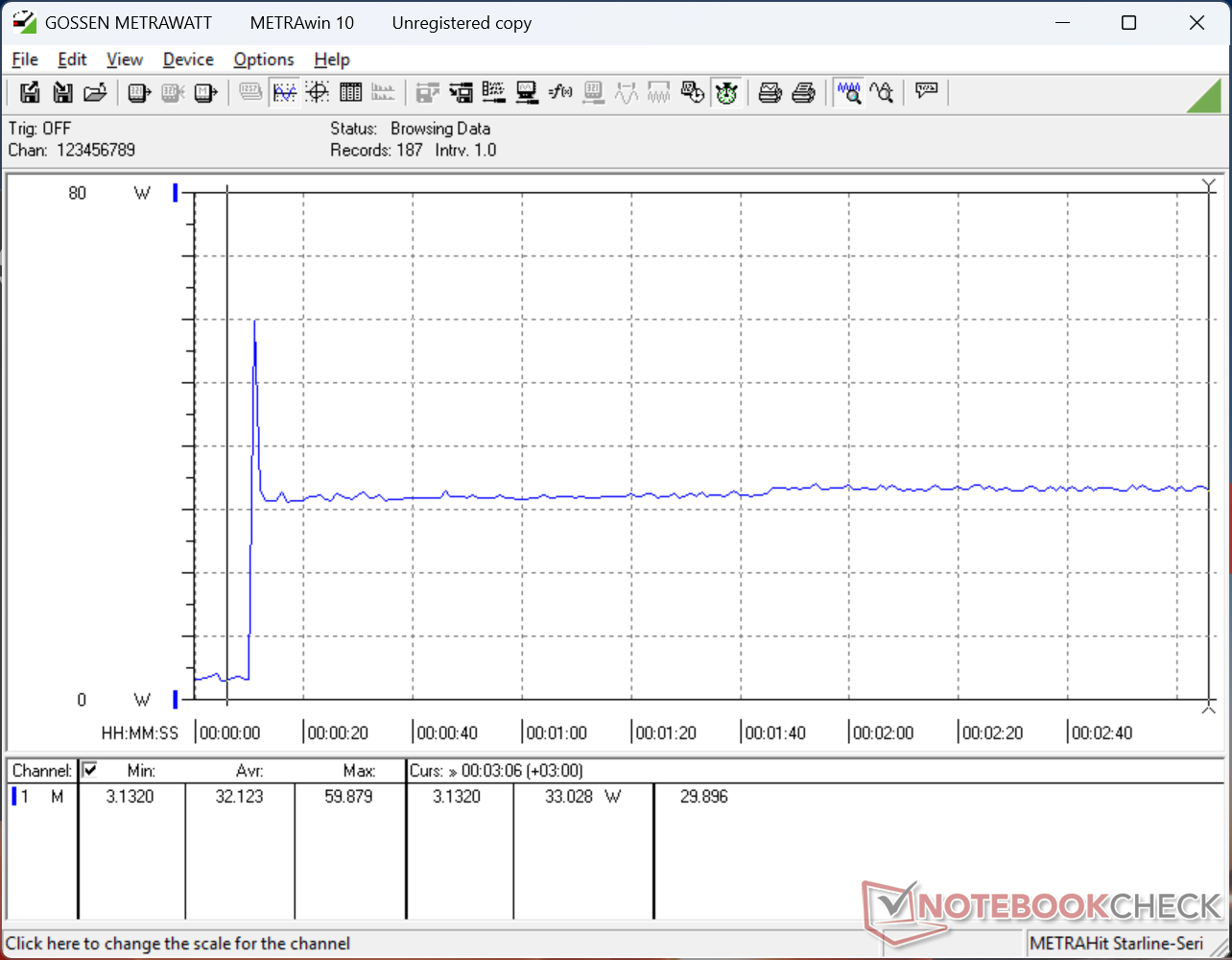 Az összfogyasztás megközelíti a Core Ultra H meghajtású MSI Summit E13 AI Evo-t, miközben gyorsabb processzorteljesítményt és hasonló grafikus teljesítményt kínál. Megjegyzendő, hogy a fogyasztás folyamatosan csökken 48 W-ról 35 W-ra, amikor a Cyberpunk 2077-en üresjáratban van, ami a teljesítmény idővel történő lassulására utal, ami kiegészíti a fenti GPU-teljesítmény szakaszban rögzített lassuló képkocka sebességet.