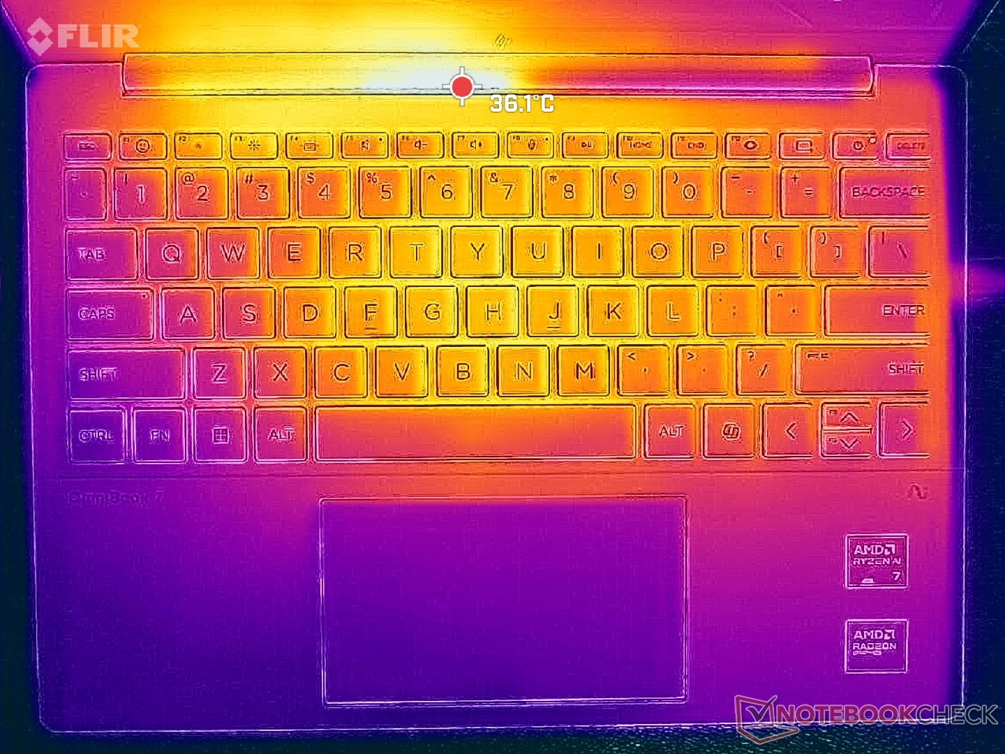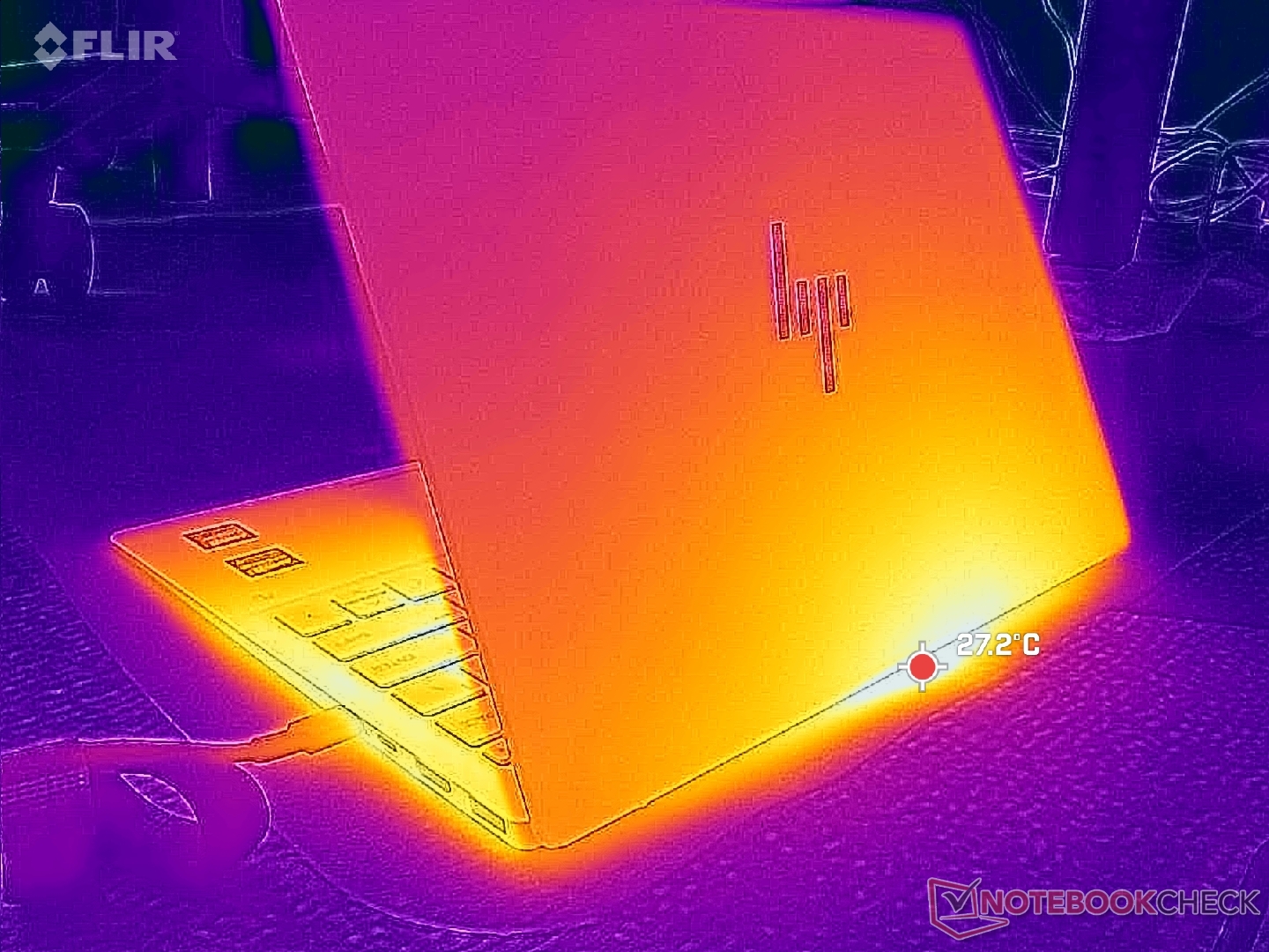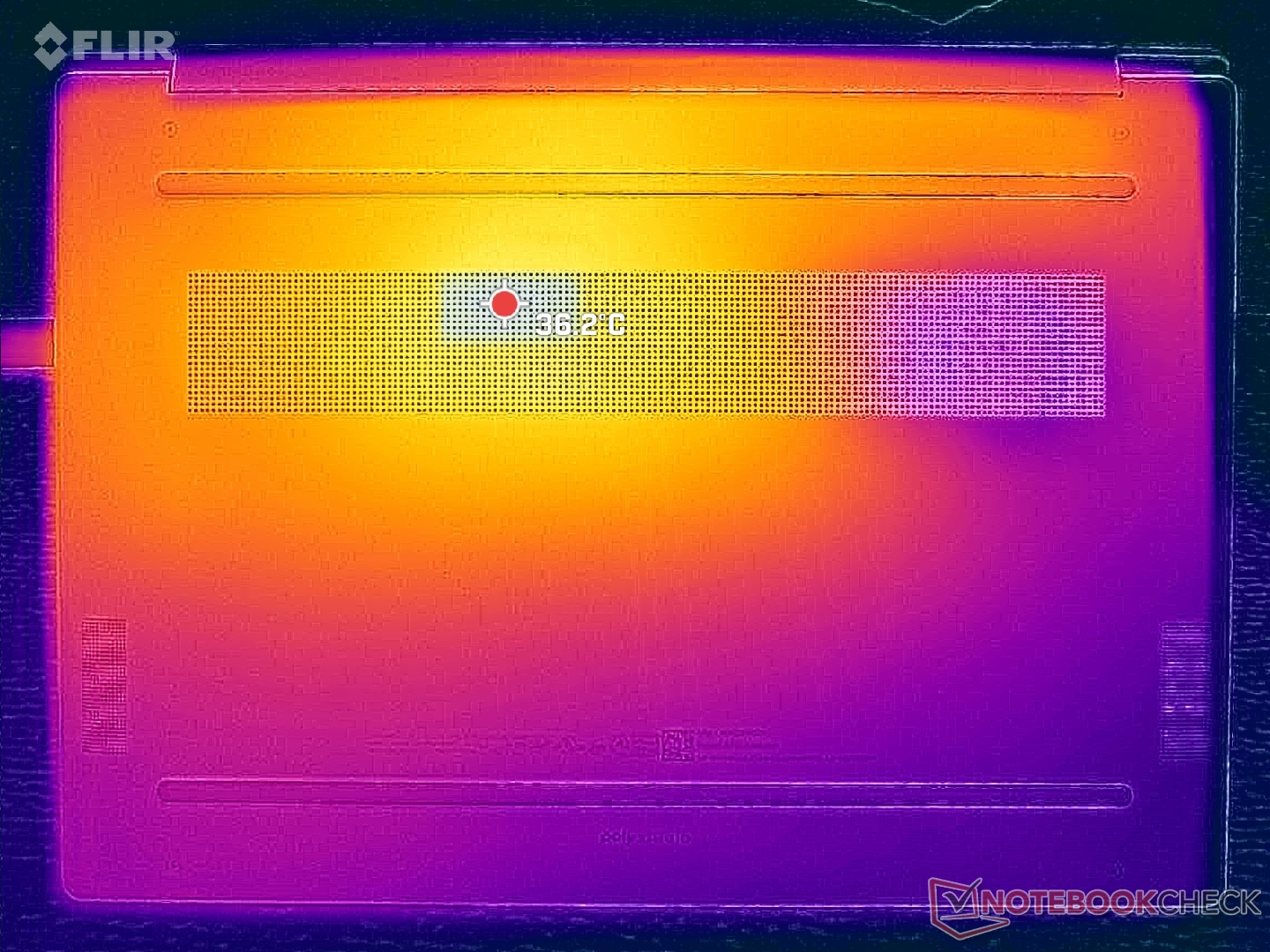 (+) A felső oldalon a maximális hőmérséklet 35.8 °C / 96 F, összehasonlítva a 35.9 °C / 97 F átlagával , 21.4 és 59 °C között a Subnotebook osztálynál.
