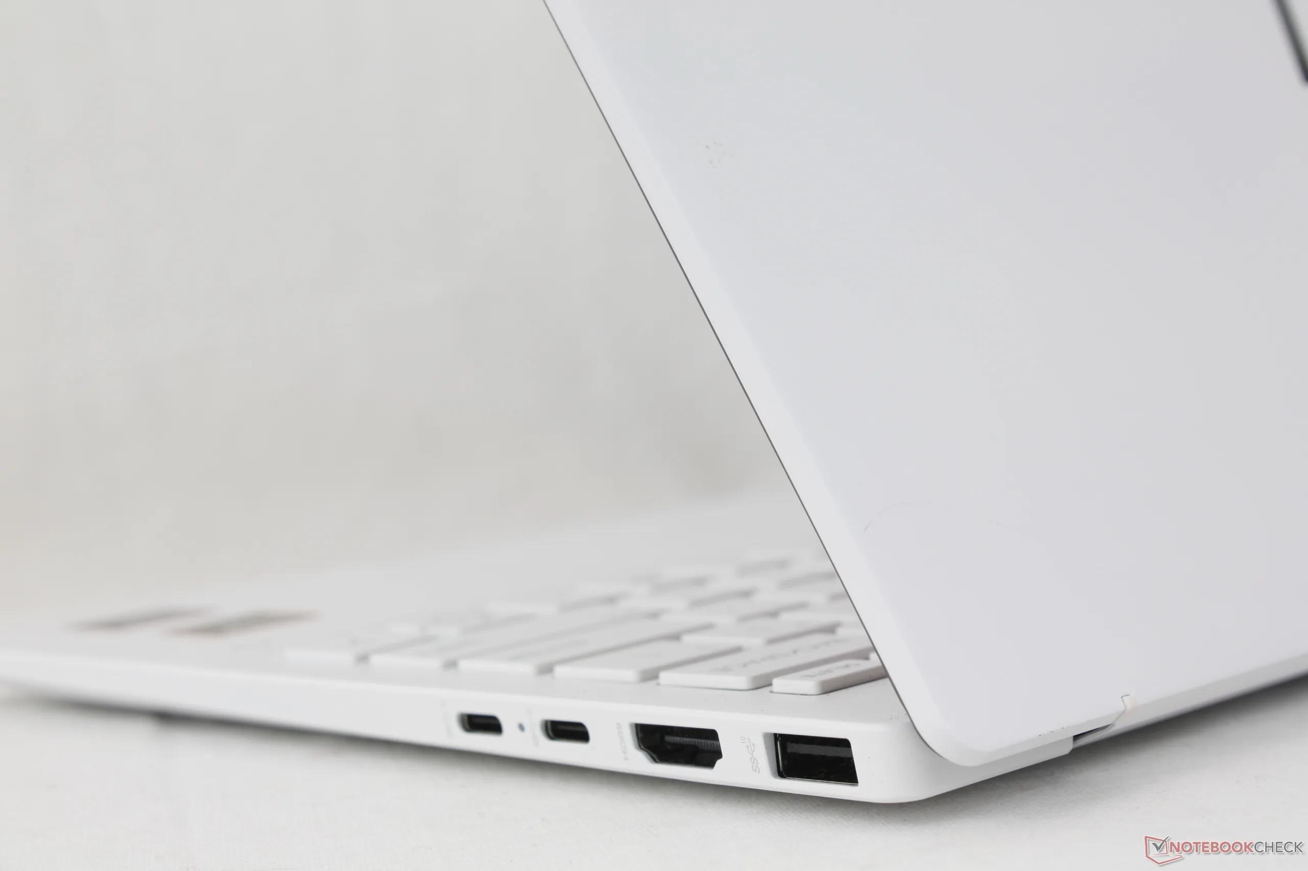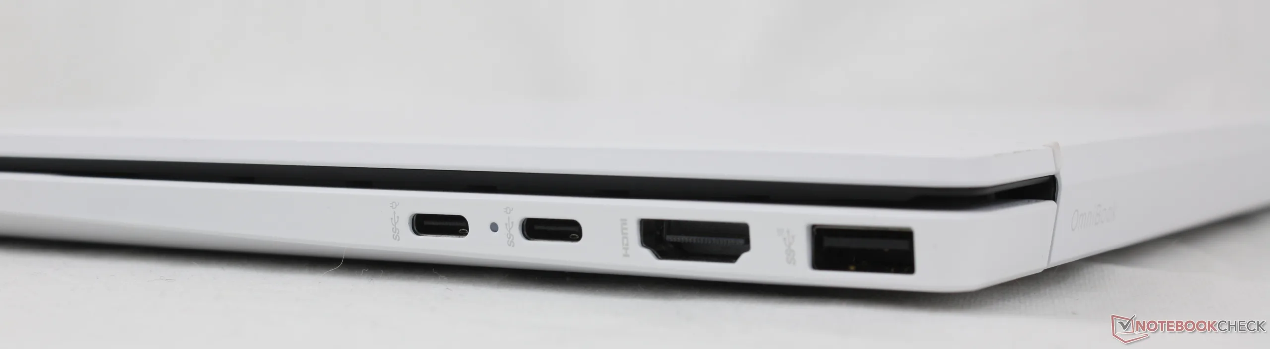A nagyon alacsony súly ellenére meglehetősen sok beépített port van. Valójában a HP több portot kínál, mint a ZenBook S13. Az egyetlen hátránya, hogy az USB-C portok nem Thunderbolt-kompatibilisek, így az OmniBook 7 Aero 13 dokkolási képességei nem olyan erősek, mint a legtöbb Intel-alapú ultrabooké.
