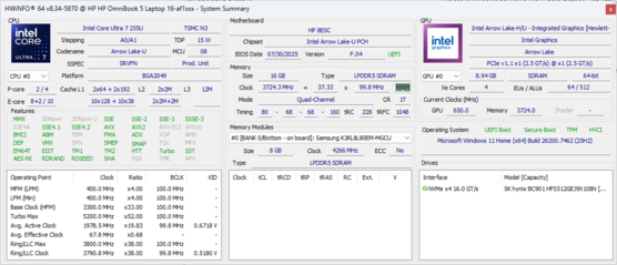 | HP Omnibook 5 16-af1037nr Intel Core Ultra 7 255U ⎘ Intel Graphics 4-Core iGPU (Meteor / Arrow Lake) ⎘ 16 GB Memória | Amazon: $1,225.00 List Price: 660 USD | 1.7 kg | 18.6 mm | 16.00" 1920x1200 142 PPI IPS | |