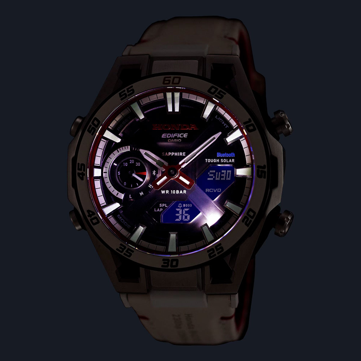 Számos tervezési részlet közvetlenül utal a Honda motorsport-örökségére. A kiemelkedő fehér kerámia lünetta színe megegyezik a Championship White színével - a Honda autók hivatalos győzelmi színével -, és egy aranyozott "60" betűvel is jelzi a mérföldkőnek számító évet. A lünetta skálája öt másodperces lépésekben számol felfelé, ami egy ügyes részlet, amely nem található az alap ECB-2300 modelleken.