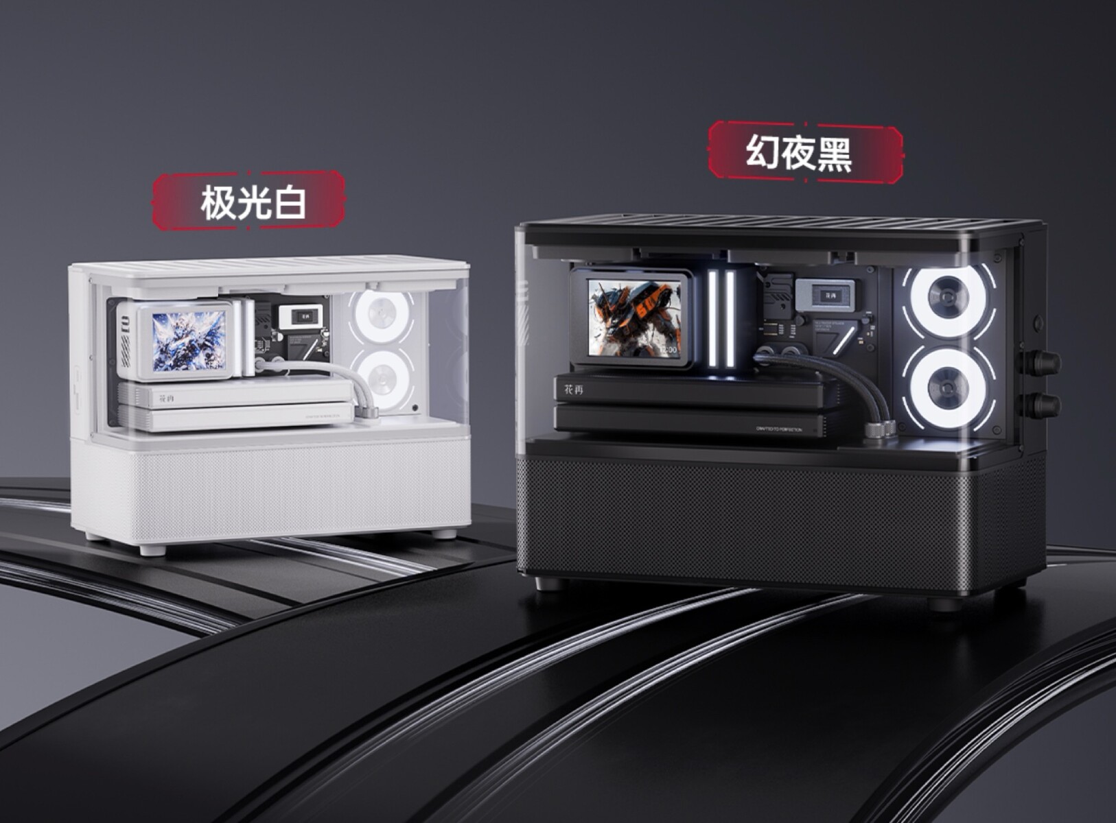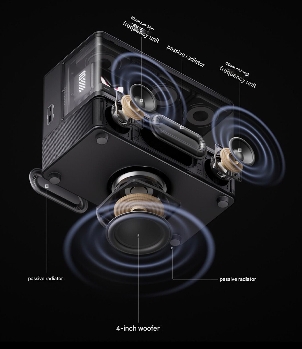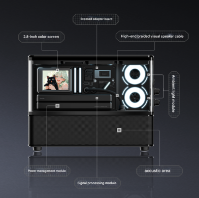 A vastag, fonott hangszórókábelek egy folyadékhűtés csatornáira emlékeztetnek, míg a 2,8 hüvelykes érintőképernyő a CPU-hűtőt szimbolizálja. Ez a kijelző nemcsak grafikákat és animációkat képes megjeleníteni, hanem még a csatlakoztatott számítógép aktuális CPU- és GPU-terhelését, valamint RAM-használatát is képes megmutatni, ami még hatékonyabbá teszi az illúziót. A hangszóró hátoldalán egy USB-C és egy USB-A port található, amelyek mindegyike akár 35 wattos teljesítményű töltésre is képes a csatlakoztatott eszközökön.