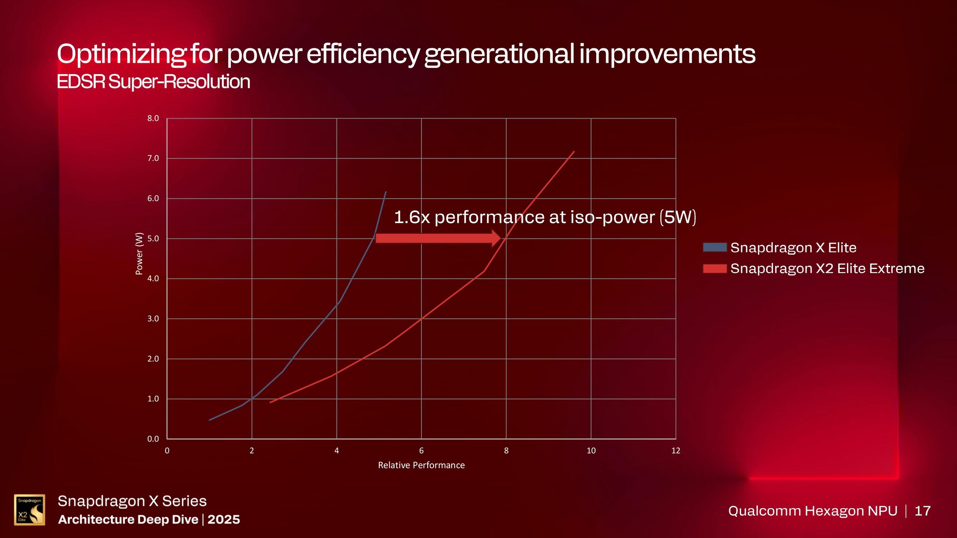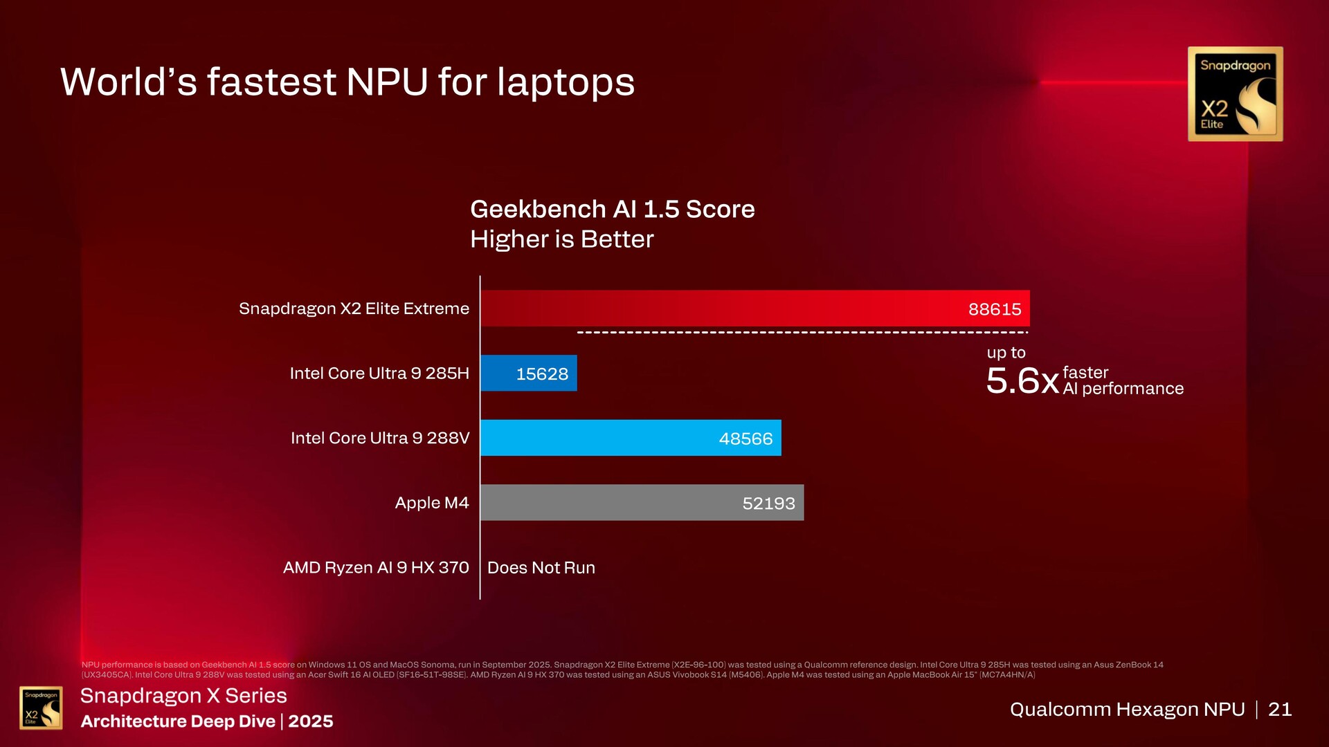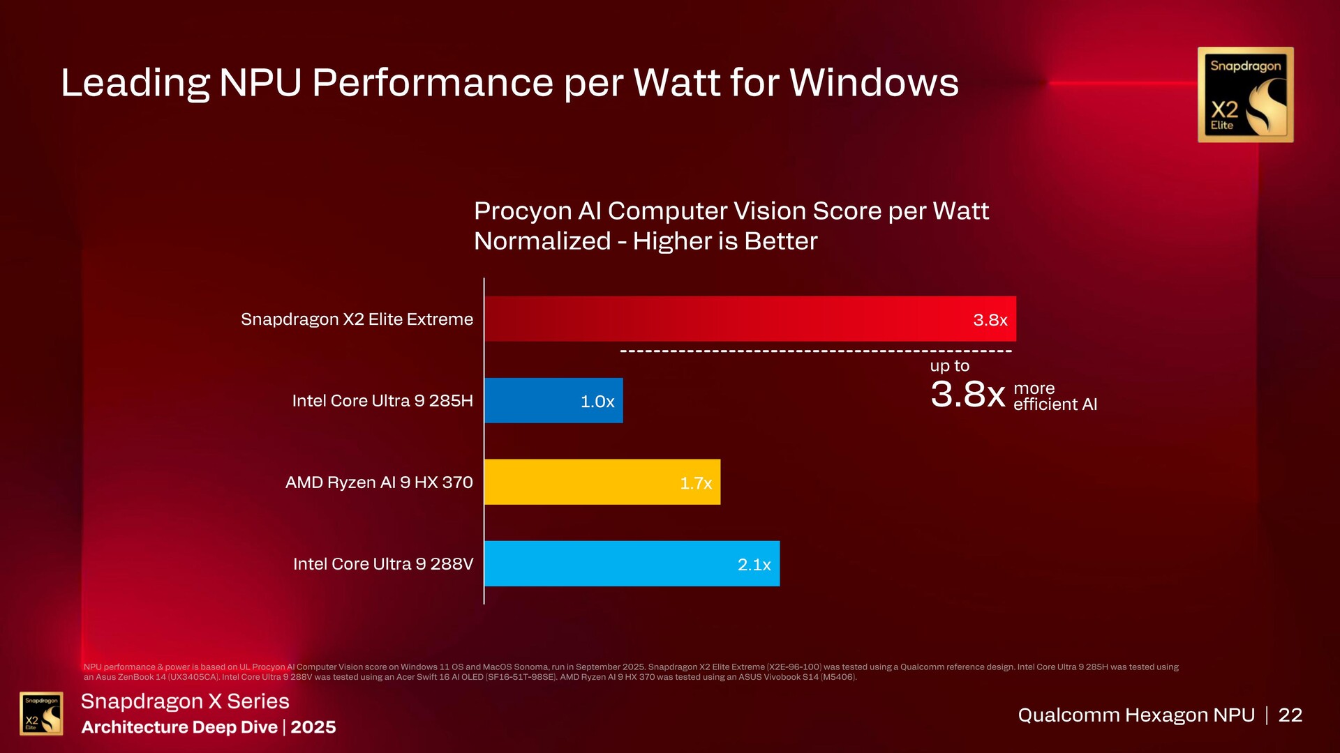 A Qualcomm a Snapdragon X2 Elite Extreme-ben található Hexagon NPU 6-ot a világ leggyorsabbjaként emlegeti, amely a Snapdragon X2 Elite Extreme-hez képest akár 5,7x nagyobb teljesítményt és 3,8x nagyobb hatékonyságot kínál Core Ultra 9 285H-hoz képestnPU-jával a Procyon AI Computer Visionben.