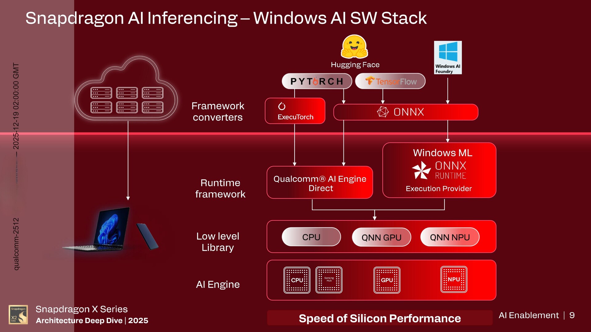 A Qualcomm szerint a Snapdragon AI inferencia a Windows AI szoftvercsomaggal együttműködve teszi lehetővé a következő generációs ügynöki munkaterhelést. A támogatott nyílt ML keretrendszerek közé tartozik a PyTorch és a TensorFlow.