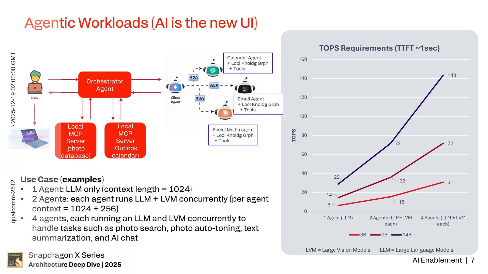 A Qualcomm kiemelte, hogy egyetlen LLM-ügynök 1024 kontextushosszúsággal és 14 milliárd paraméterrel (14B) akár 143 TOPS AI feldolgozási teljesítményt igényel, míg két (3B) vagy négy (7B) ügynöki felhasználási eset, amelyekben egyenként egy LLM és LVM fut egyidejűleg, akár 72 TOPS-t is igényelhet.