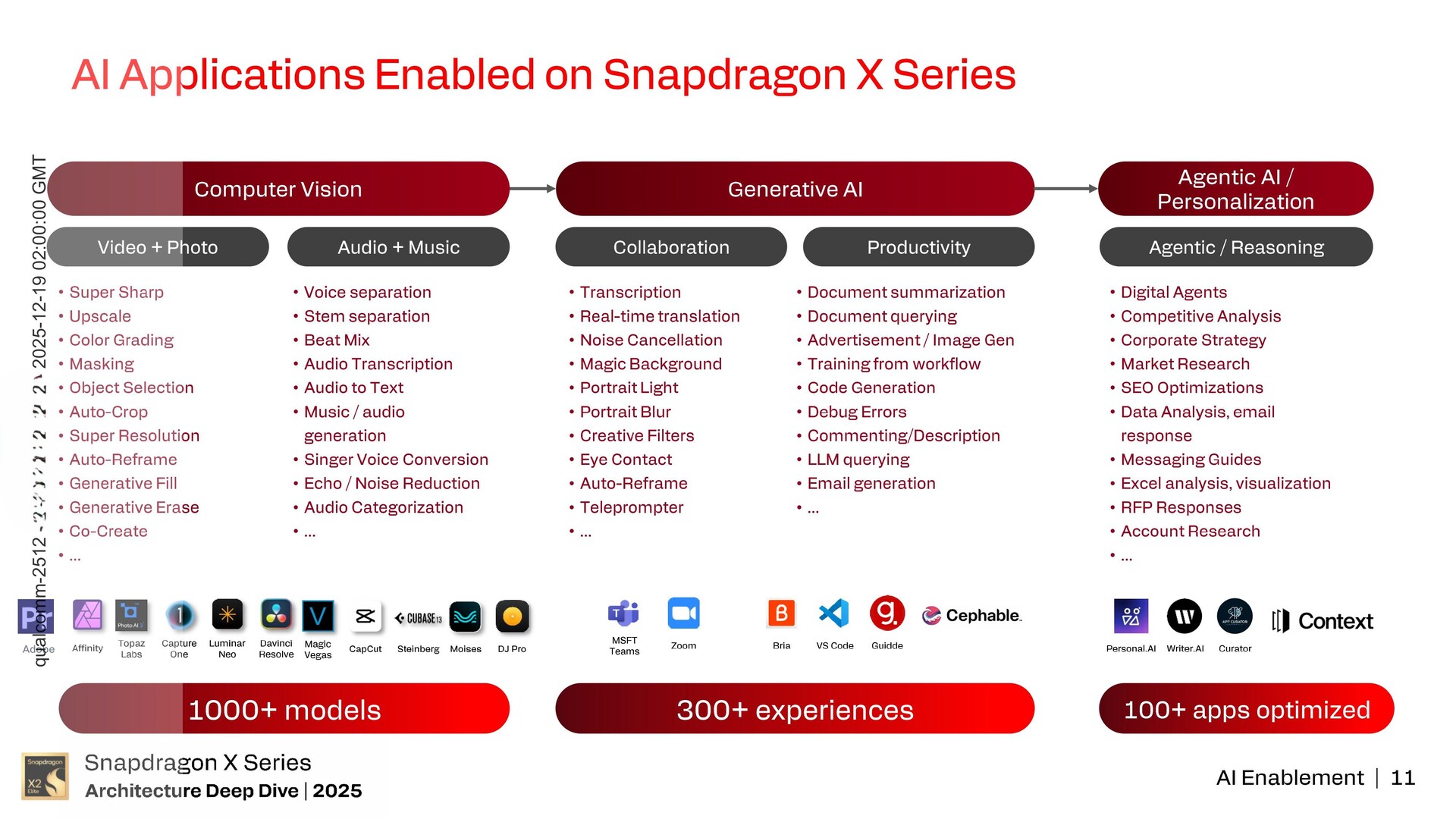 A Snapdragon X sorozatú SoC laptop CPU-k jelenleg több mint 1000 modellt és több mint 300+ tapasztalatot támogatnak, amelyek az audio, videó, fotó, generatív AI, ügynöki AI és következtetés területén terjednek el.