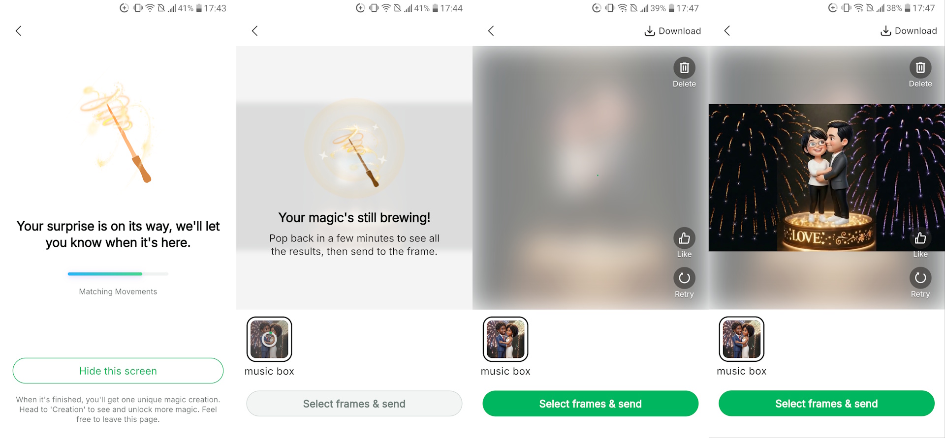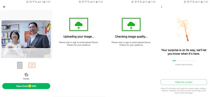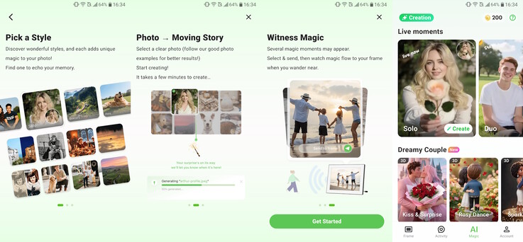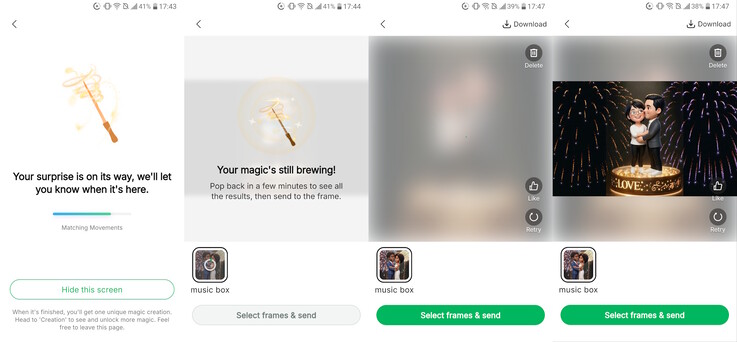 Miután az alkalmazásban kiválasztottuk az animációt és a fényképet, a mesterséges intelligencia automatikusan elemzi a fényképet a megfelelőség szempontjából, beleértve az életkort, a képminőséget és a téma megfelelő keretezését. Az AI feldolgozása néhány percig is eltarthat, a kész animáció pedig feltölthető a képkeretbe vagy letölthető az okostelefonra.