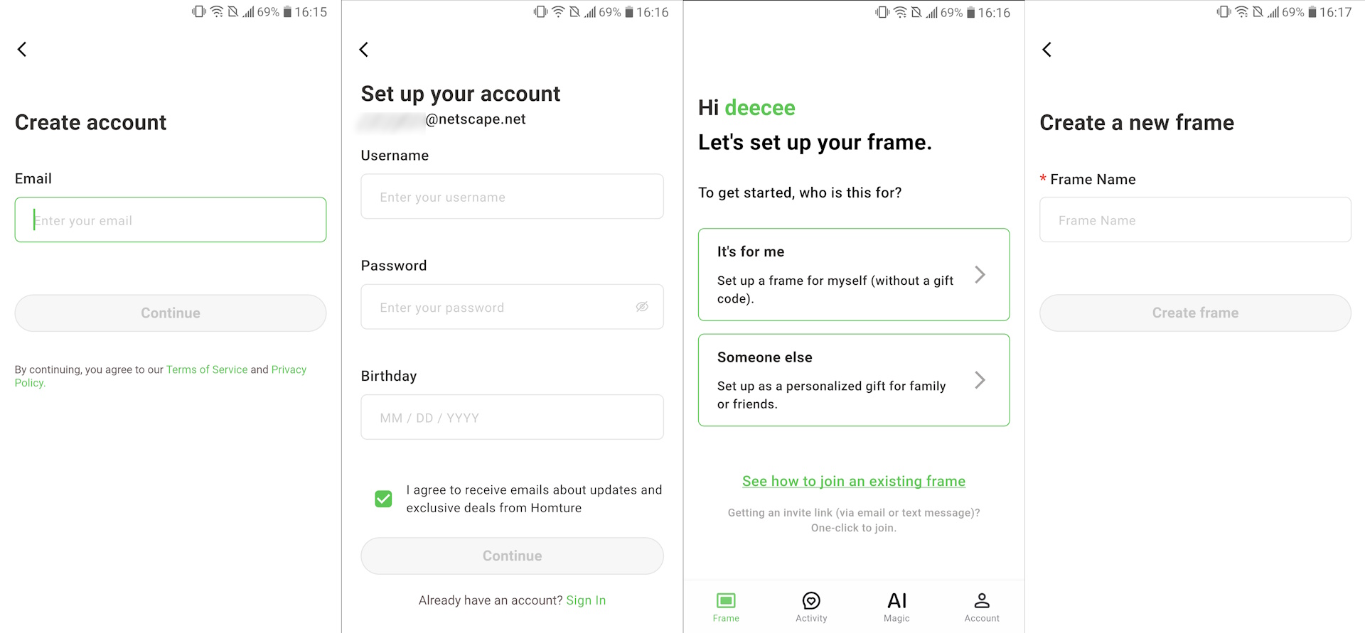 A 10,1 hüvelykes Homture Magic Frame egyszerű kialakítású, textúrázott műanyag keretbe épített LCD-kijelzővel rendelkezik. A keretnek van egy kihajtható fémállványa az asztali használathoz. A hátoldalon található a bekapcsológomb a hálózati csatlakozóval együtt.