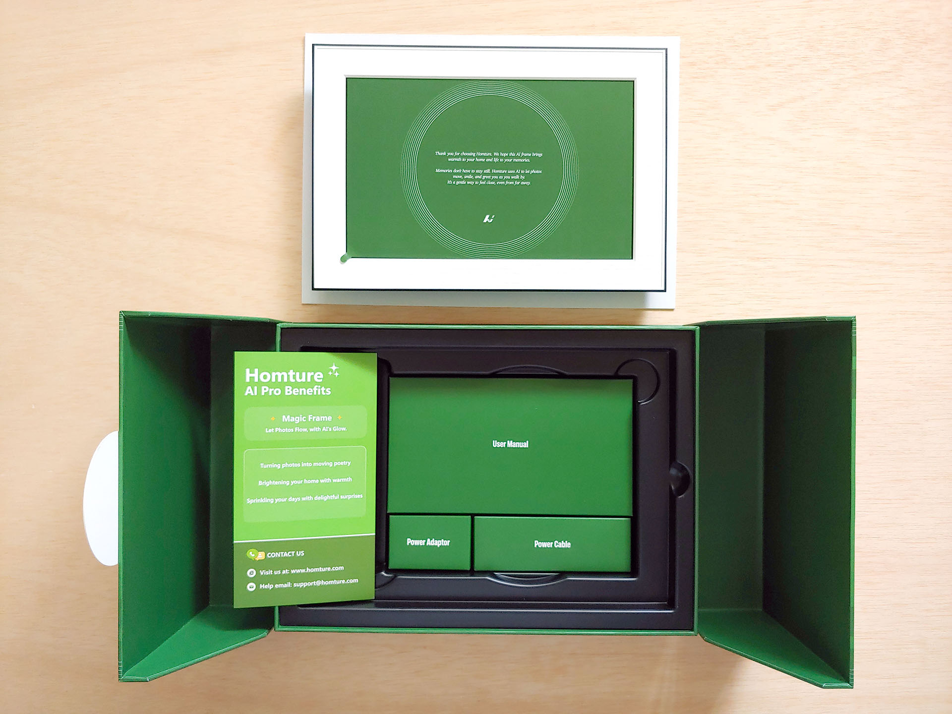 A Homture digitális képkeret egyszerűen beállítható és használható, lehetővé téve a tulajdonosok számára, hogy gyorsan feltölthessék és élvezhessék kedves fotóikat. A fényképek színezhetőek és animálhatóak az AI segítségével, így a statikus képek rövid, figyelemfelkeltő videókká alakíthatók. Megjelenítés céljából korlátlan számú fotó tölthető fel a felhőalapú tárhelyre.
