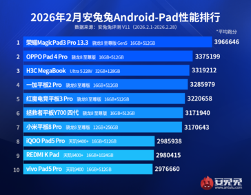 Például a Honor MagicPad3 Pro vezeti a táblagépek rangsorát. Ez a készülék 2025 végén került forgalomba, és egy Snapdragon 8 Elite Gen 5. Pontosabban ez az egyetlen olyan készülék a listán, amelyet a Qualcomm jelenlegi generációs zászlóshajó chipkészlete hajt, ami megmagyarázza dominanciáját. A második helyen a Snapdragon 8 Elite-meghajtású Oppo Pad4 Pro, míg a harmadik helyet a H3C MegaBook foglalja el, hála a Intel Core Ultra 5 228V. Ez a táblázat valószínűleg változni fog az elkövetkező hónapokban, figyelembe véve a nemrégiben debütált Snapdragon 8 Elite Gen 5 táblagépet, mint a Lenovo Legion Tab Gen 5.