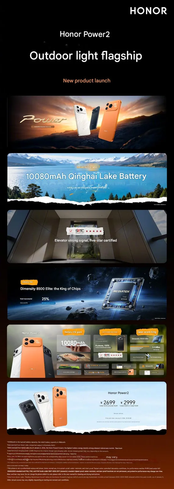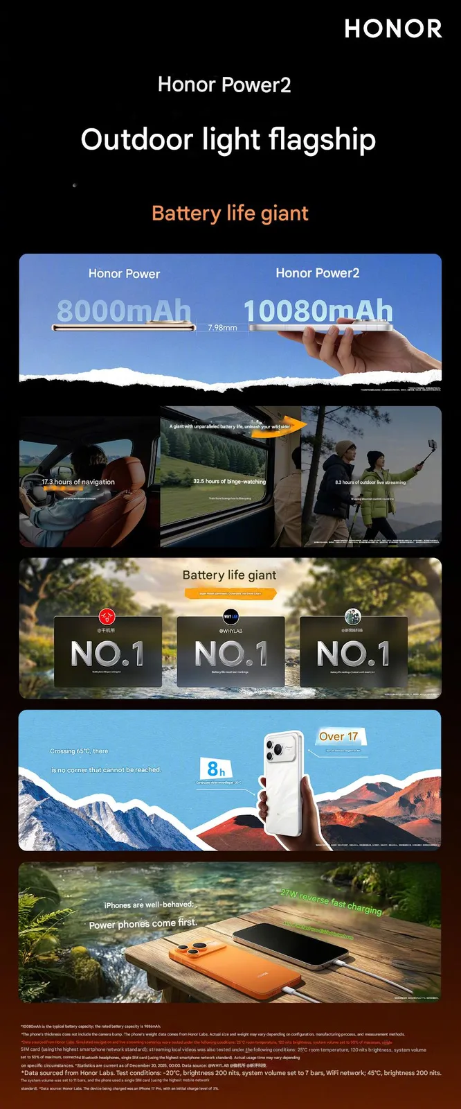 Honor nem tud versenyre kelni a Apple weboldallal a specifikációk tekintetében, az akkumulátor kivételével. Az ultravékony, 8 mm-es okostelefonban található 10 080 mAh-s akkumulátormodul a MediaTek új Dimensity 8500 Elite középkategóriás chipkészletével kombinálva állítólag 8,3 órányi folyamatos élő streaminget, 32,5 órányi binge-watchinget vagy 17,3 órányi navigációt biztosít. Állítólag rendkívül hideg hőmérsékleten is megbízhatóan működik. A 27 wattos fordított töltésnek köszönhetően az okostelefon power bankként is használható, a hatalmas akkumulátor pedig maximum 80 wattal tölthető.