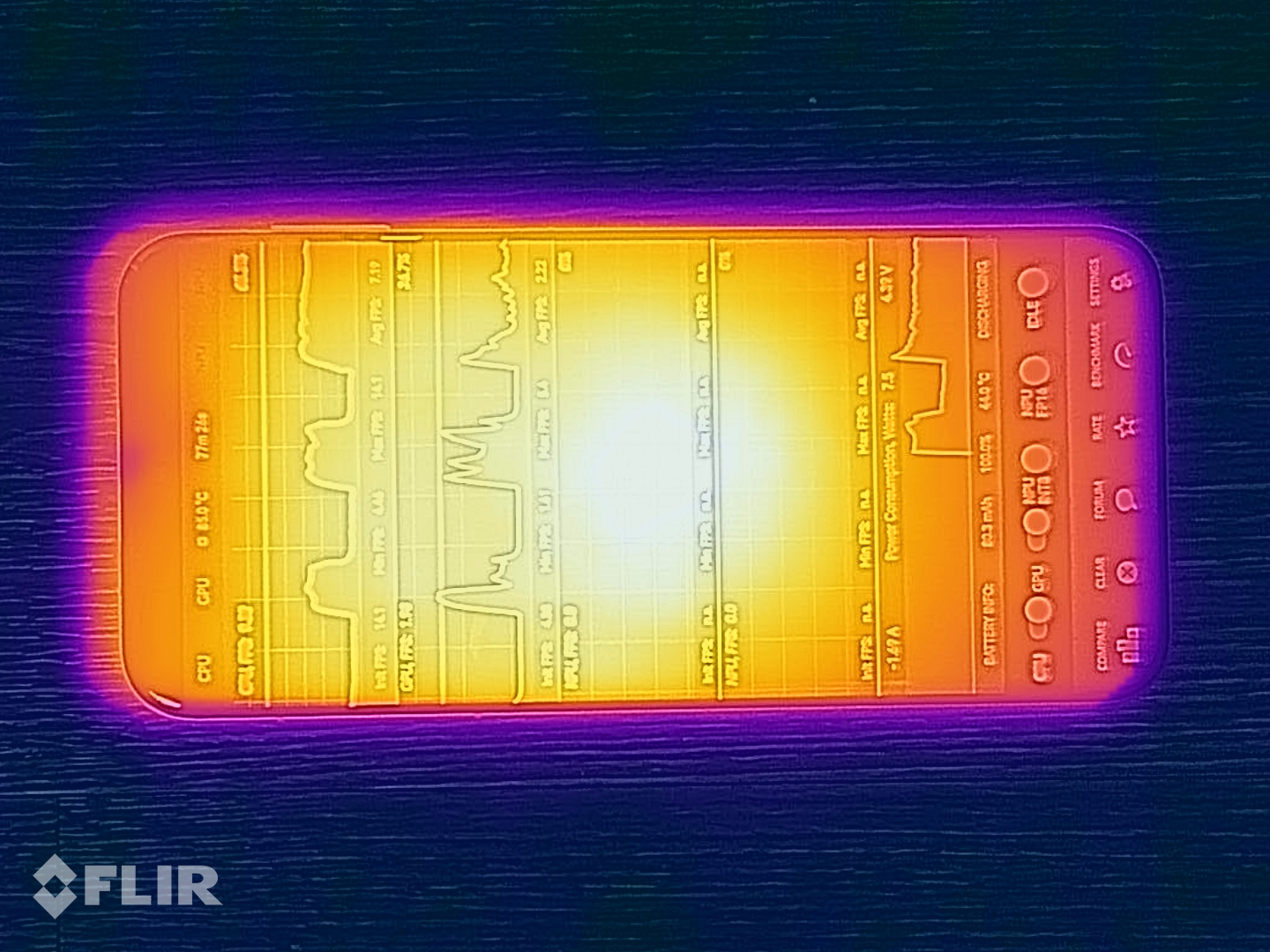 (±) A felső oldalon a maximális hőmérséklet 43.6 °C / 110 F, összehasonlítva a 35.2 °C / 95 F átlagával , 21.9 és 247 °C között a Smartphone osztálynál.
