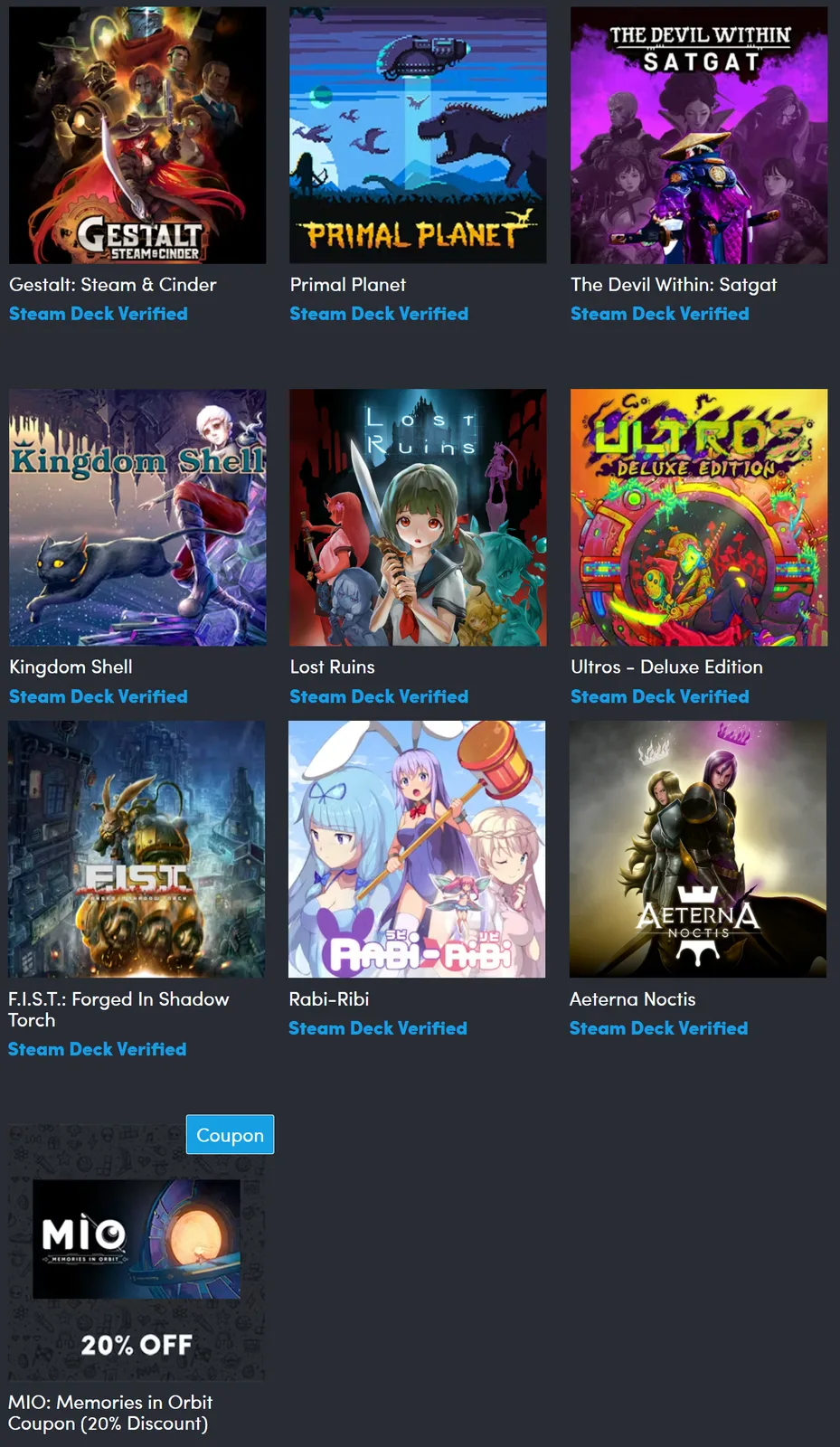 - F.I.S.T.: Forged In Shadow Torch - leginkább egy diselpunk metroidvania játékként írható le, melyben nehéz harc, felfedezés és platformelemek keverednek. Ez egy 2021-es cím, amely jelenleg 86%-os pozitív értékeléssel rendelkezik, és 15,99 dollárért vásárolható meg (az eddigi legalacsonyabb ár 4,79 dollár).