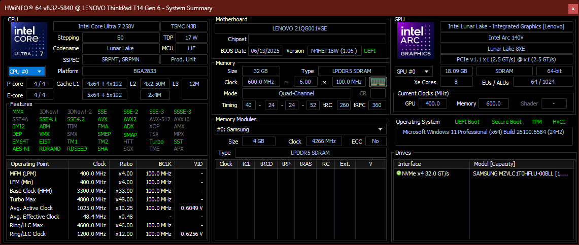 | Lenovo ThinkPad T14 Gen 6 21QG001VGE Intel Core Ultra 7 258V ⎘ Intel Arc Graphics 140V ⎘ 32 GB Memória, 1024 GB SSD | Amazon: $2,097.95 List Price: 1960 Euro | 1.5 kg | 22 mm | 14.00" 1920x1200 162 PPI IPS LED | |