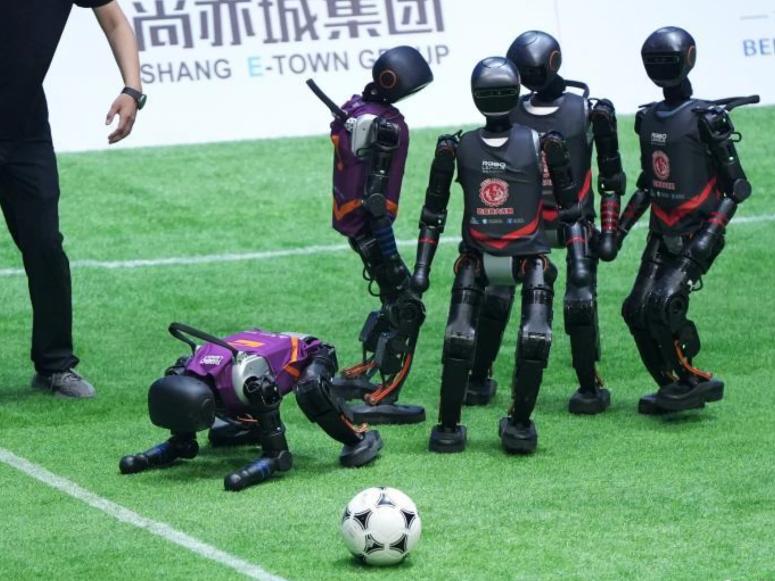 Peking, 2025. június 28. - A pekingi Smart E-Sports Centerben először versenyeztek humanoid robotok egy teljesen autonóm futballtornán egy kompakt műfüves pályán. Négy egyetemi csapat - a Tsinghua Egyetem (THU Robotics), a Kínai Mezőgazdasági Egyetem (Mountain Sea), a Pekingi Információs Tudományos és Technológiai Egyetem (Blaze) és egy másik Tsinghua csapat (Power Lab) - a Booster Robotics azonos T1-es robotjait programozta saját AI-algoritmusaival, majd fej-fej melletti mérkőzéseken tette próbára őket.