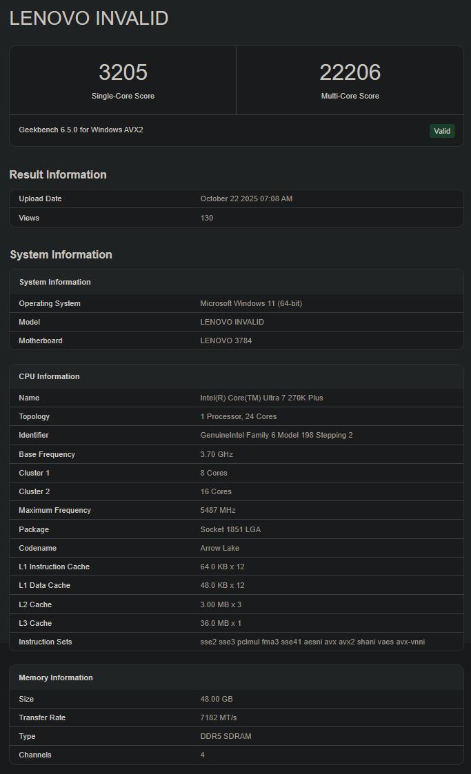 A Geekbench 6.5-ben 3,205 és 22,206 pontot ért el egy- és többmagos teszteken. A Core Ultra 7 270K Plus 24 maggal (8 P + 16 E), 24 menettel és 5,4 GHz-es boost órajelekkel rendelkezik. Egy meg nem nevezett Lenovo PC-t hajt meg 48 GB DDR5-7182 (DDR5-7200) RAM-mal, amelyen Windows 11 fut. A Geekbench hátsó oldaláról kiderül, hogy egy GeForce RTX 5090 D-vel együtt tesztelték, amely csak Kínában kapható GPU.