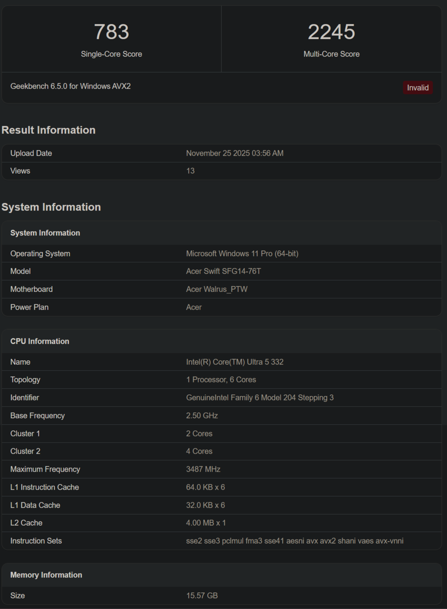 A belépőszintű Core Ultra 5 322-re áttérve, a Geekbench pontszáma érvénytelennek van megjelölve. A lista azonban fényt derít a specifikációjára, nevezetesen 2 P-mag, 2 E-mag és 2 LPE-mag. Ez a bizonyos laptop az Acer Swift termékcsaládba tartozik, és 16 GB RAM-mal, RTX 5060 GPU-val és egy meg nem határozott Intel Graphics adapterrel rendelkezik.