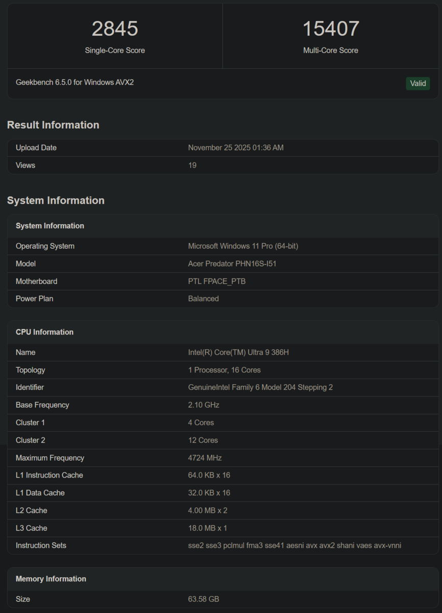 A Core Ultra 9 386H a Geekbench-en a oldalon tűnt fel. Az egy- és többmagos teszteken 2840 és 15 167 pontot ért el. Teljesítményét tekintve az Arrow Lake-alapú Core Ultra 285H-hoz hasonlóan teljesít (2,878/15,673). Core Ultra X társához hasonlóan 16 magos CPU-val rendelkezik, 4 P-maggal, 8 E-maggal és 4 LPE-maggal.