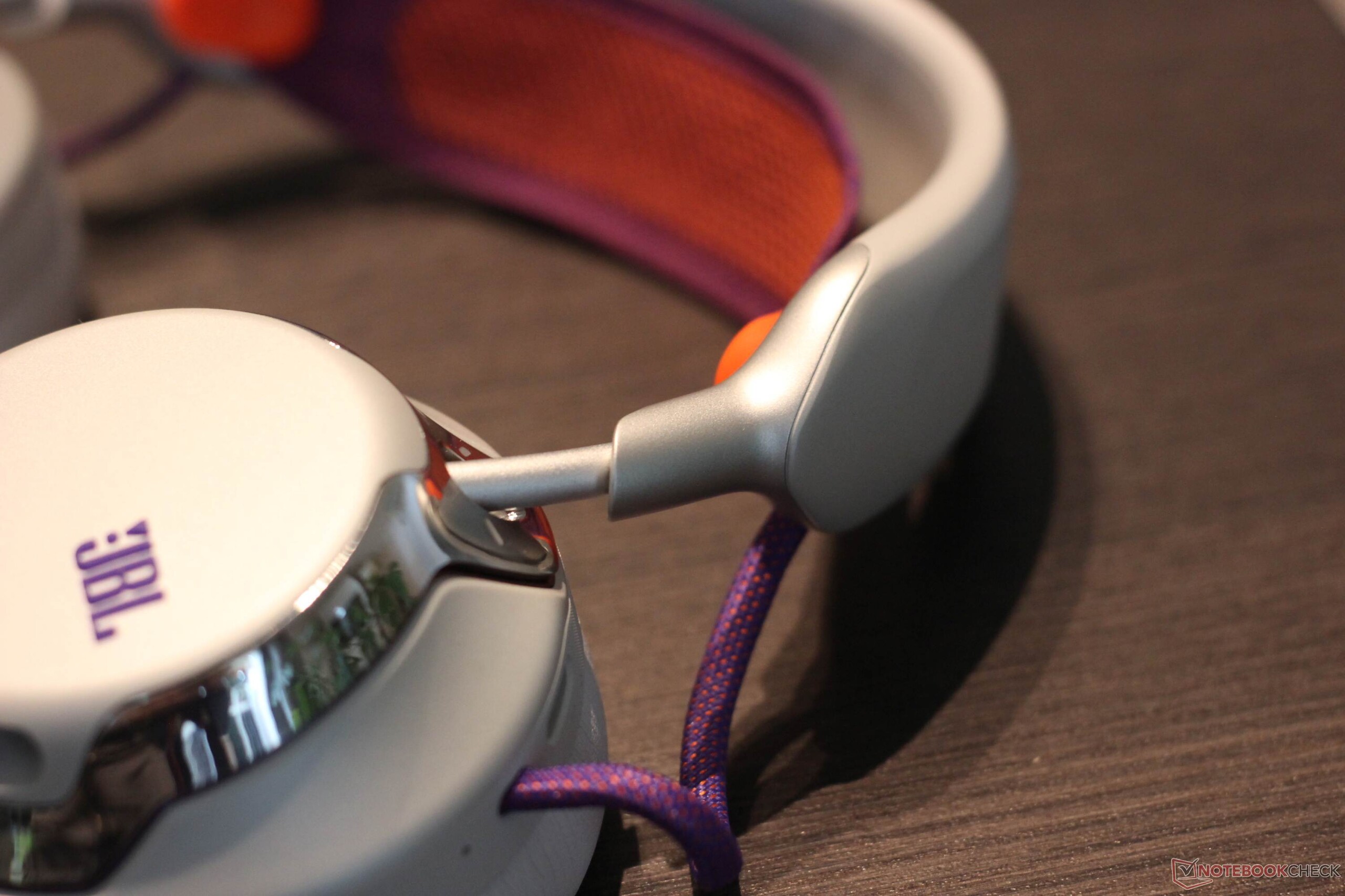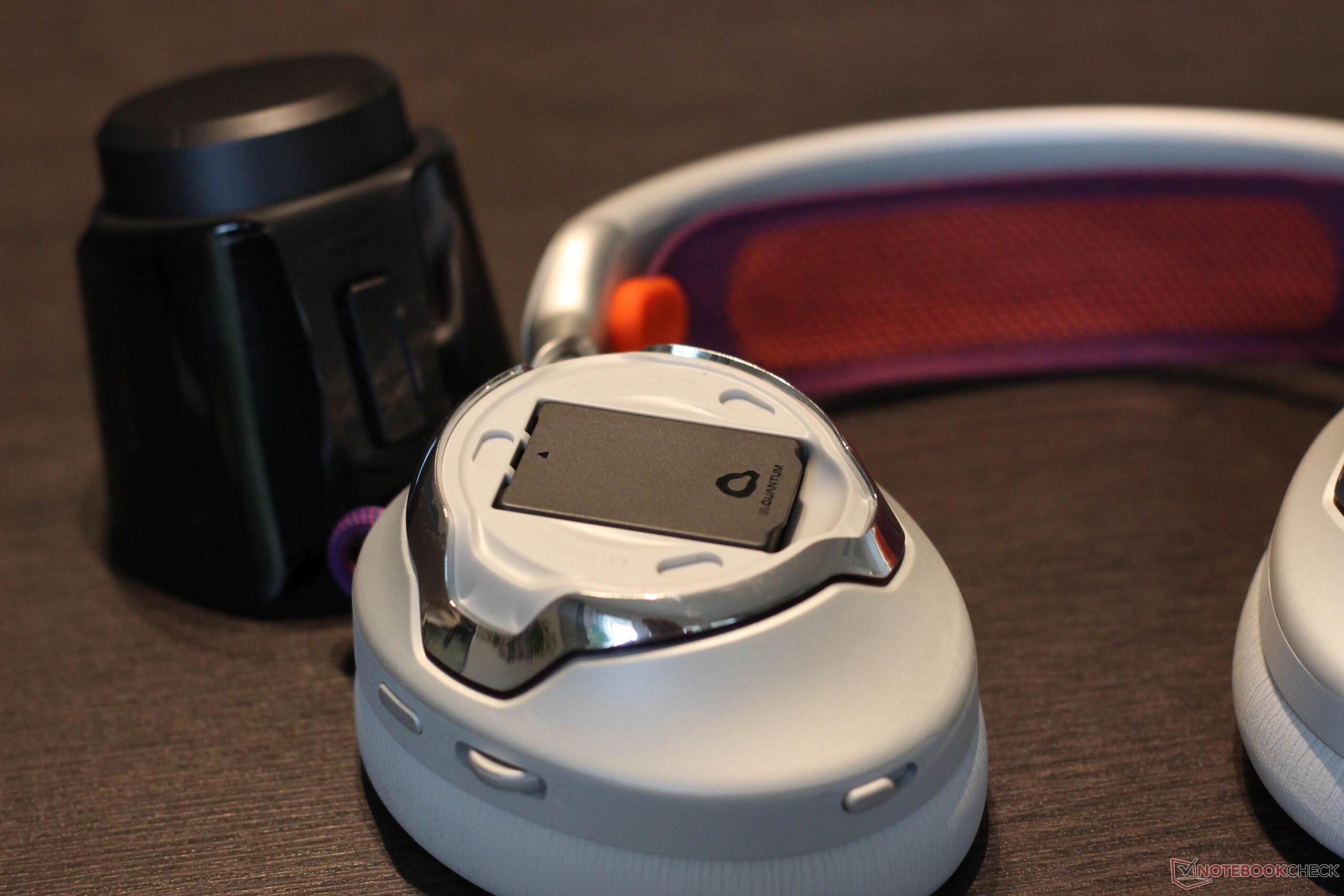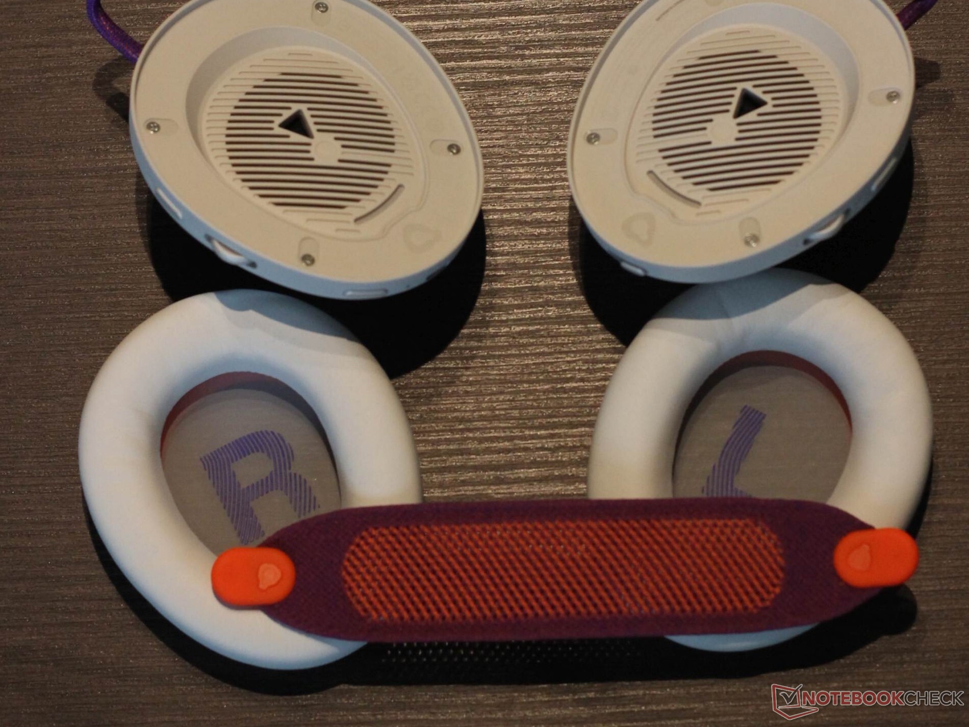A JBL Quantum 950 vezeték nélküli hangszóróhoz átfogó tartozékkészlet tartozik. Tartalmaz egy C típusú USB-n keresztül csatlakoztatható bázisállomást. Ez számos funkciót kínál: Nemcsak 2,4 GHz-es dongle-ként működik, hanem vezérlőegységként és a mellékelt két újratölthető akkumulátor egyikének töltőállomásaként is. Egy boom mikrofon és egy kifejezetten kalibrálásra szolgáló mikrofon is a tartozék. Egy nagyon hasznos vászontáska is tartozik hozzá. Maga a fejhallgató fém ékezetekkel és három gombbal, két forgókapcsolóval és egy csúszkával rendelkezik. A gombok kellemes nyomáspontot kínálnak. Maga a headset feltűnő dizájnnal rendelkezik, fémszínű ékezetekkel, és anyagként is fémet használnak. A fülpárnákat mágnes tartja a helyén, és könnyen cserélhetőek. Maga a fejpánt hálós szövetből készült, amely szintén cserélhető - ez általában nagyon pozitív tulajdonság. Ugyanez vonatkozik az akkumulátorra is, amely szintén könnyen cserélhető. Ahogy az várható volt, a fémszínű felületek kissé érzékenyek az ujjlenyomatokra. A fehér modellváltozat nem fukarkodik a kontrasztokkal. A fejpánt lila és narancssárga színű, akárcsak a jól látható kábelek és a JBL logó.