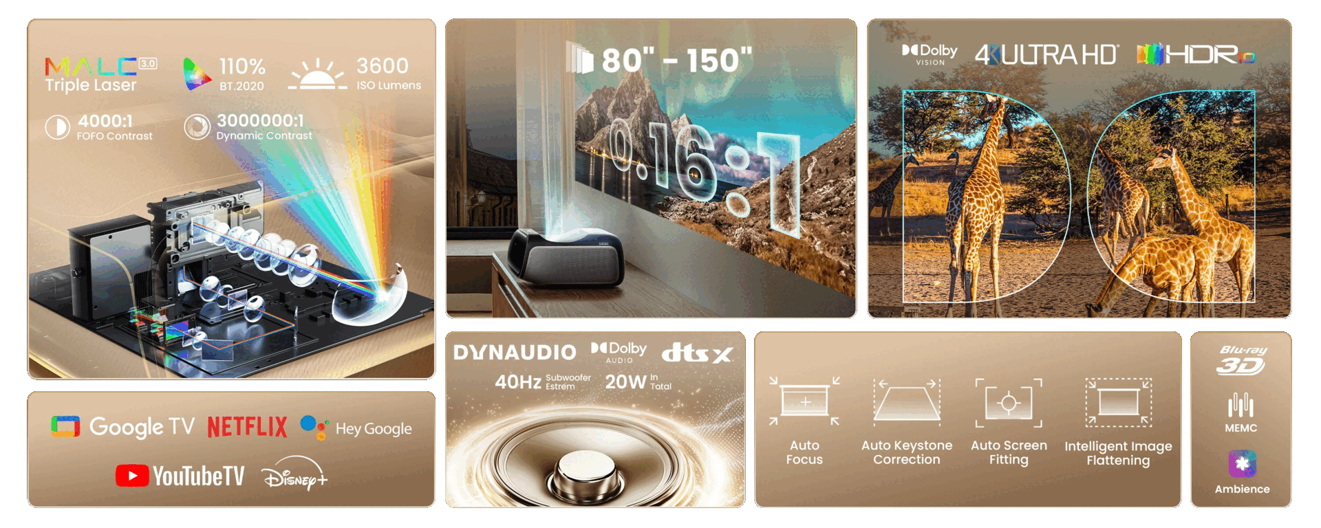 A lézertechnológiával felszerelt Jmgo O2S Ultra TV projektor akár 3600 ISO lumen fényerőt kínál, amely akár 150 hüvelyk széles képet is biztosít 4K felbontással, 0,16:1 dobási aránnyal és 3 000 000:1 dinamikus kontrasztaránnyal. Támogatja a HDR 10-et és az olyan képjavító eszközöket is, mint az autofókusz, az automatikus keystone-korrekció, az automatikus képernyőillesztés és az intelligens képelegyengetés. Mindezek tetejébe a vállalat azt állítja, hogy a projektor a legrövidebb vetítési arányt kínálja a piacon.