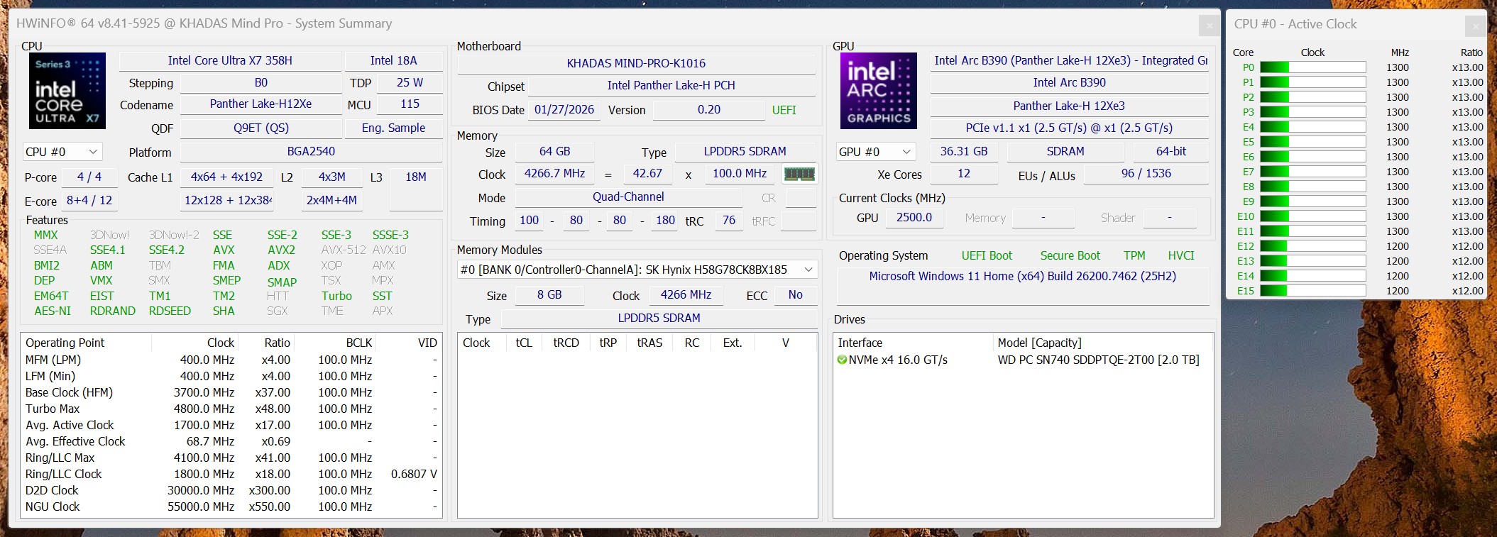 A Khadas Mind Pro-ban használt Intel Core Ultra X7 358H az egyik legmodernebb mobil processzor, amelyet az Intel jelenleg a portfóliójában tart. Modern hibrid architektúrájának köszönhetően a CPU több teljesítmény- és hatékonysági magot kombinál, így egyszerre teszi lehetővé a nagy csúcsteljesítményt és a hatékony mindennapi működést.