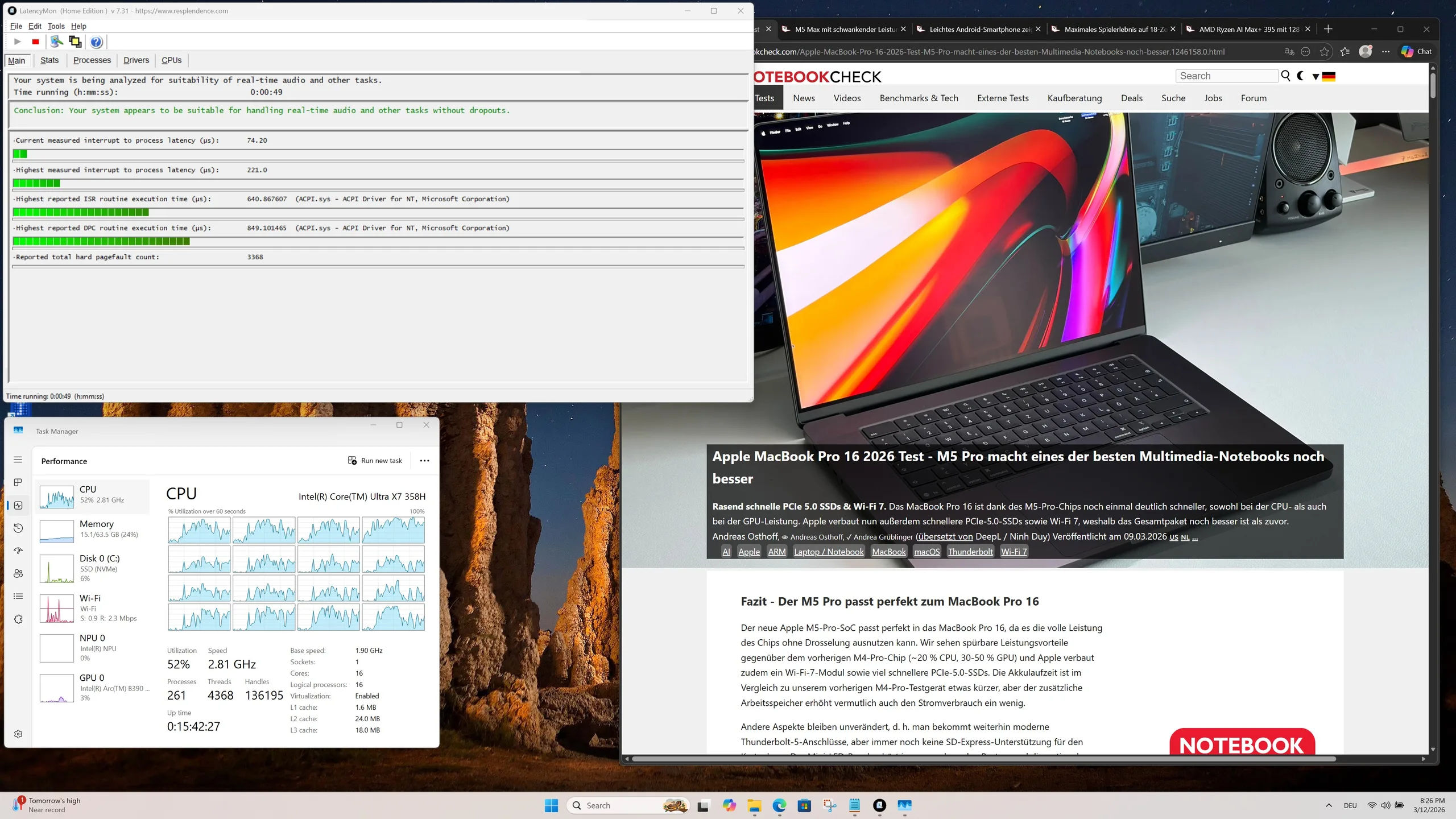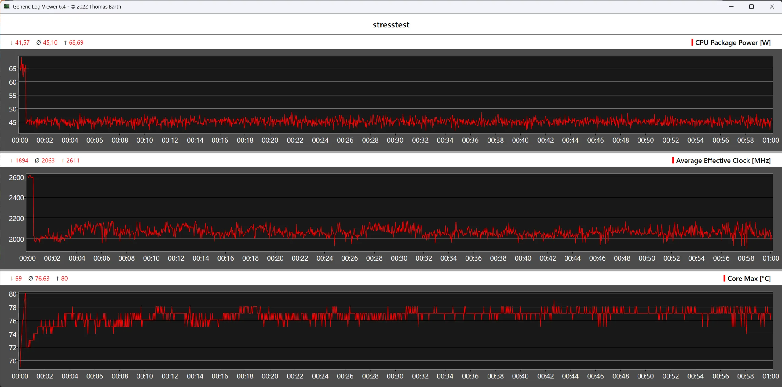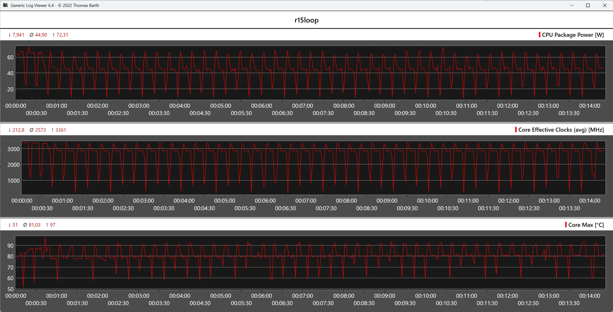 A stresszteszt során az Intel Core Ultra X7 358H rövid időre akár 80 C-os hőmérsékletet is elér, ami az Intel által kiadott maximális hőmérsékletet figyelembe véve még mindig nem kritikus. A 45 watt körüli átlagos energiafogyasztás mellett a CPU hőmérséklete ezután 76 C körül stabilizálódott, a Cinebench R15 multitesztben azonban a SoC egy kicsit melegebb lett (97 C).