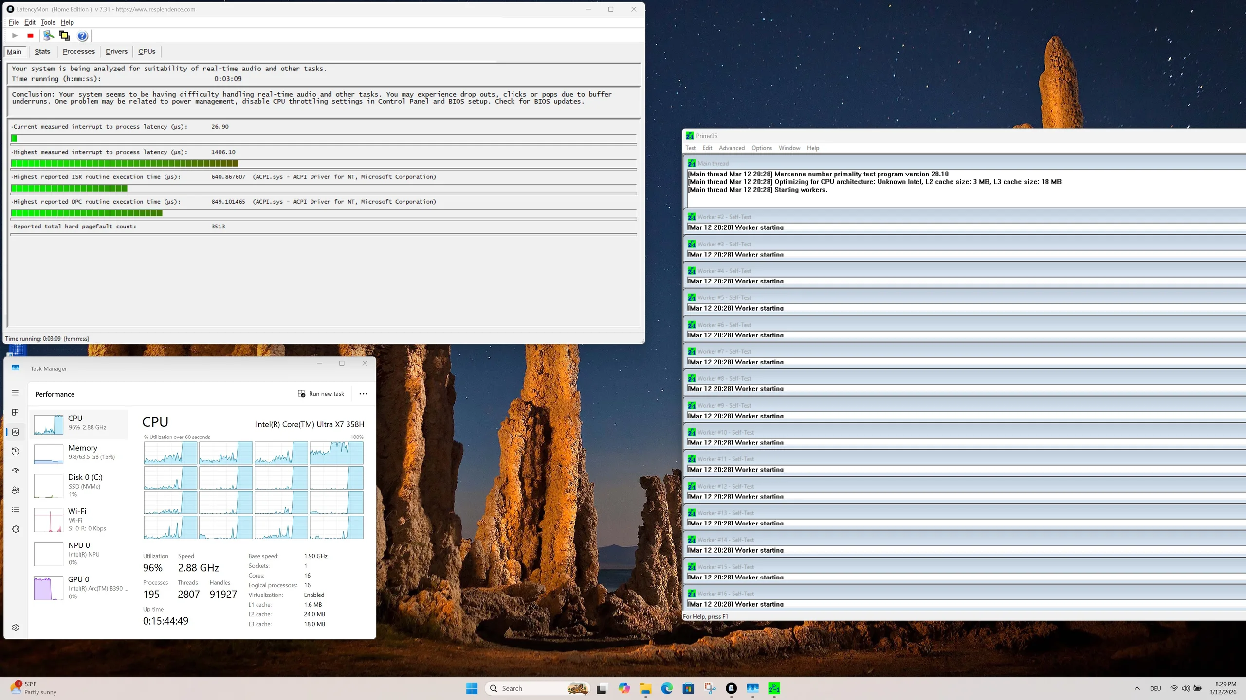 Az Intel Core Ultra X7 358H teljesítménye tartós terhelés alatt kissé visszaesik, ami jól megfigyelhető a Cinebench R15 többkörös tesztben. A processzor átlagosan 45 watt körüli energiafogyasztással dolgozik, miközben a hőmérséklet csúcsértékben akár 97 C-ra is emelkedhet.