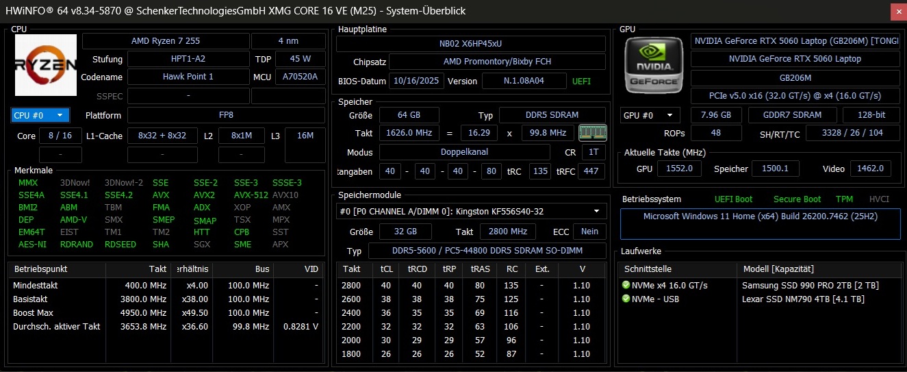 | Schenker XMG Core 16 VE M25 AMD Ryzen 7 255 ⎘ NVIDIA GeForce RTX 5060 Laptop ⎘ 64 GB Memória, 2048 GB SSD | List Price: 1935 EUR | 2.1 kg | 23 mm | 16.00" 2560x1600 189 PPI IPS | |
