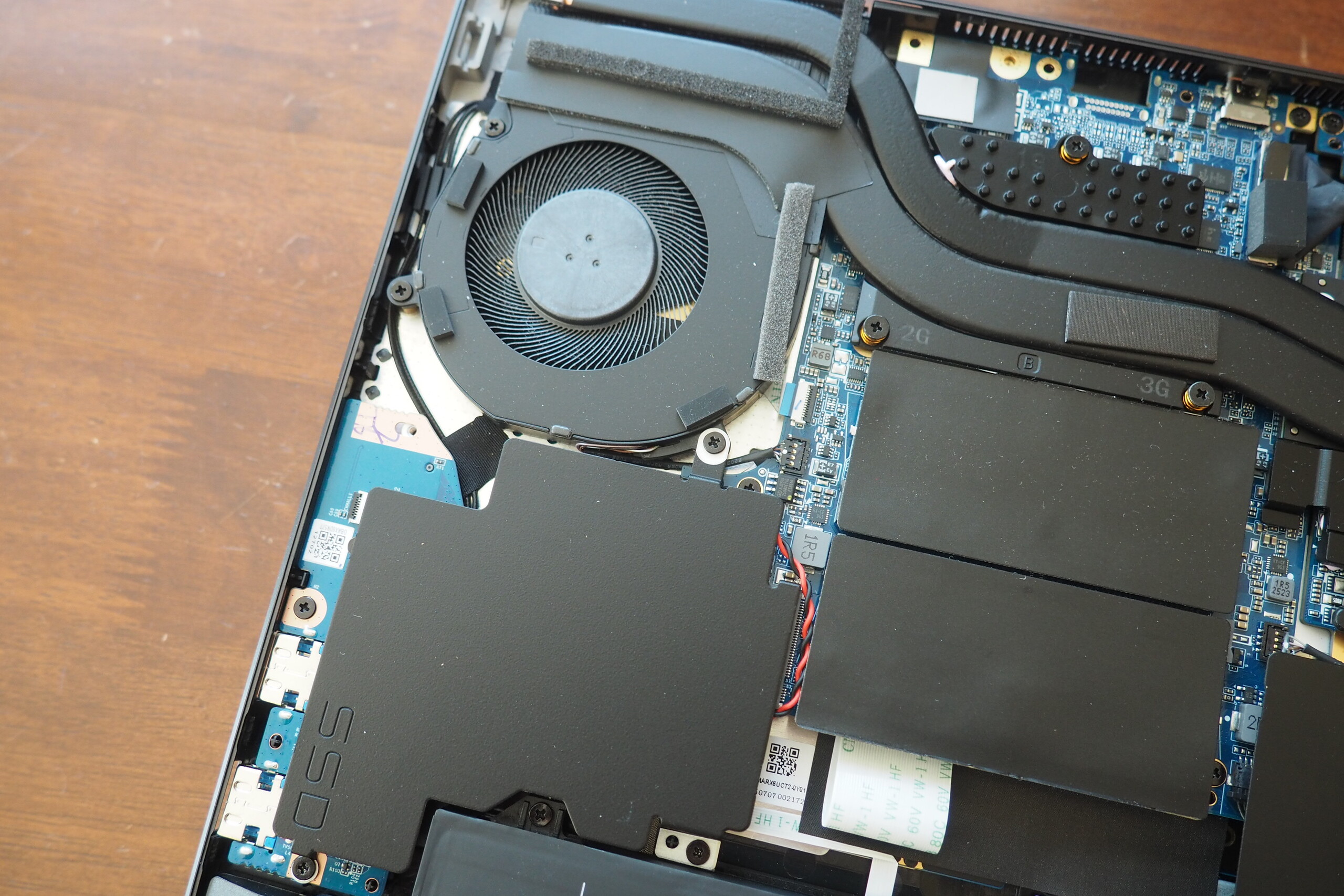 A MediaTek Wi-Fi modul tisztességes feltöltési és nagyon jó letöltési sebességet biztosít. Ezután következik az FHD webkamera, amely a laptopok szabványaihoz képest meglehetősen éles képeket készít, és fizikai adatvédelmi zárat is tartalmaz. A belső részekhez való hozzáférés 10 Phillips-fejű csavar eltávolítása után egyszerű; a belső részekről készült fotók alább találhatók.