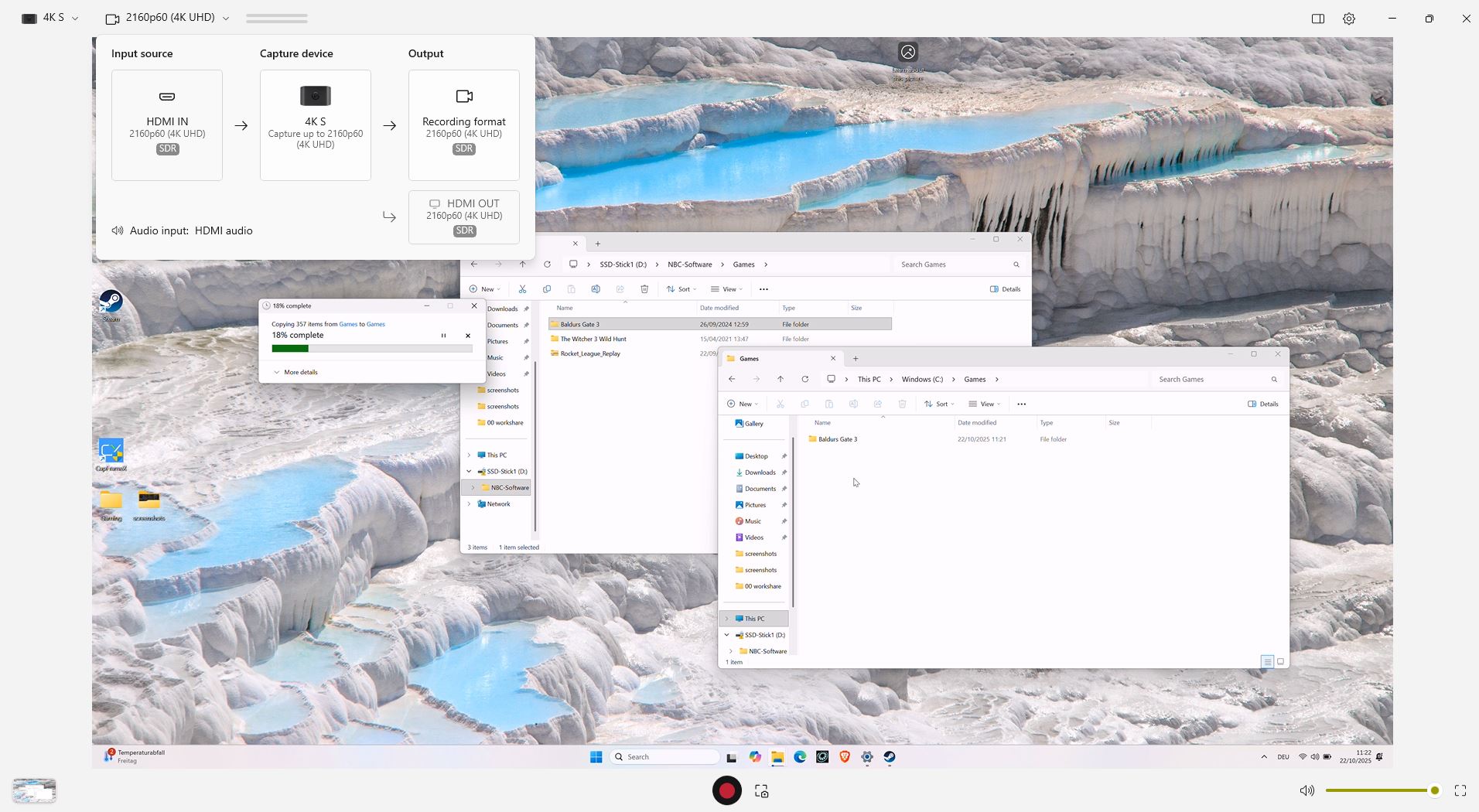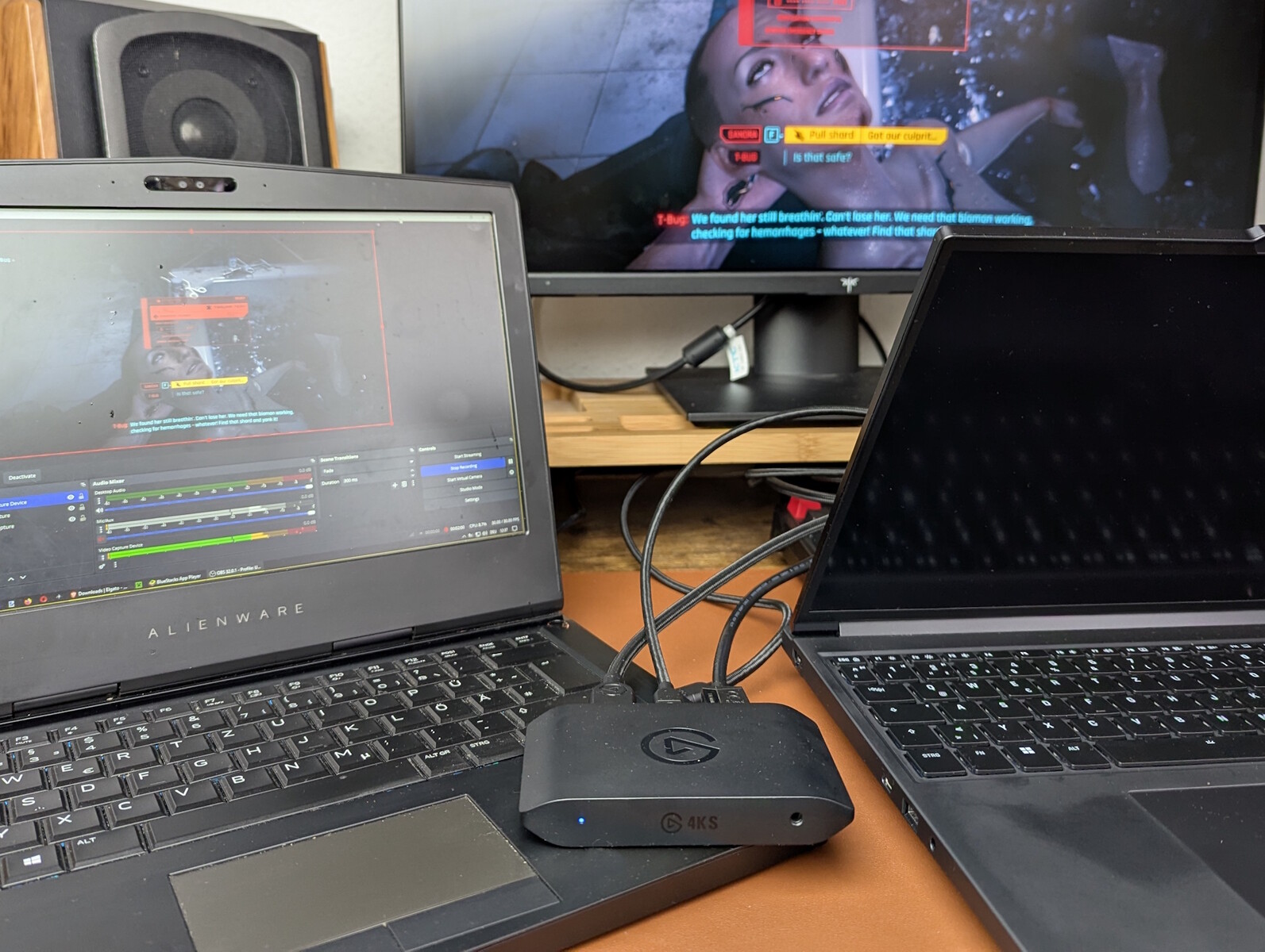 - PC-s játékok rögzítése: Egy XMG Pro 16 játéklaptopot csatlakoztattunk a 4K S-hez, és 4K-ban rögzítettük a Cyberpunk 2077 játékmenetét. Egy második laptopot USB-C-n keresztül csatlakoztattunk a rögzítőkártyához, amely az Elgato alkalmazásban vagy az OBS-ben történő rögzítésért volt felelős. Megnéztük a késleltetést is.