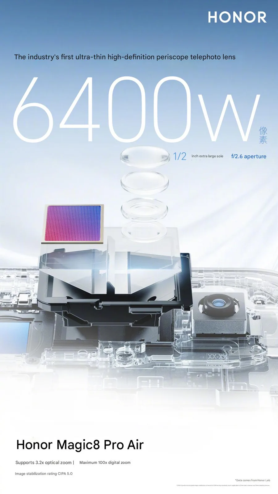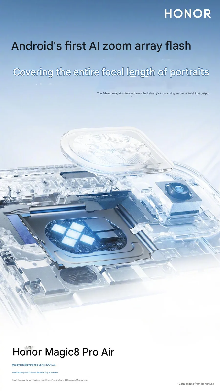 Több új teaser is megerősített néhány korábban kiszivárgott kamera adatot, mint például a fő kamera 50MP-es érzékelőjét, amely meglehetősen nagy, 1/1,3 hüvelykes és f/1,6 rekeszértékű. Ugyanez vonatkozik a 3,2x periszkópos teleobjektív kamerára is, amely a Honor állítása szerint a legvékonyabb az iparágban, és 1/2 hüvelykes 64MP-es érzékelővel és f/2,6 rekesszel rendelkezik. Egy AI zoom vakut is hirdetnek, amely az összes portré fókusztávolságot lefedné, és akár 200 luxot vagy 50 luxot is elérne 2 méteres vagy 6,6 lábnyi távolságból.