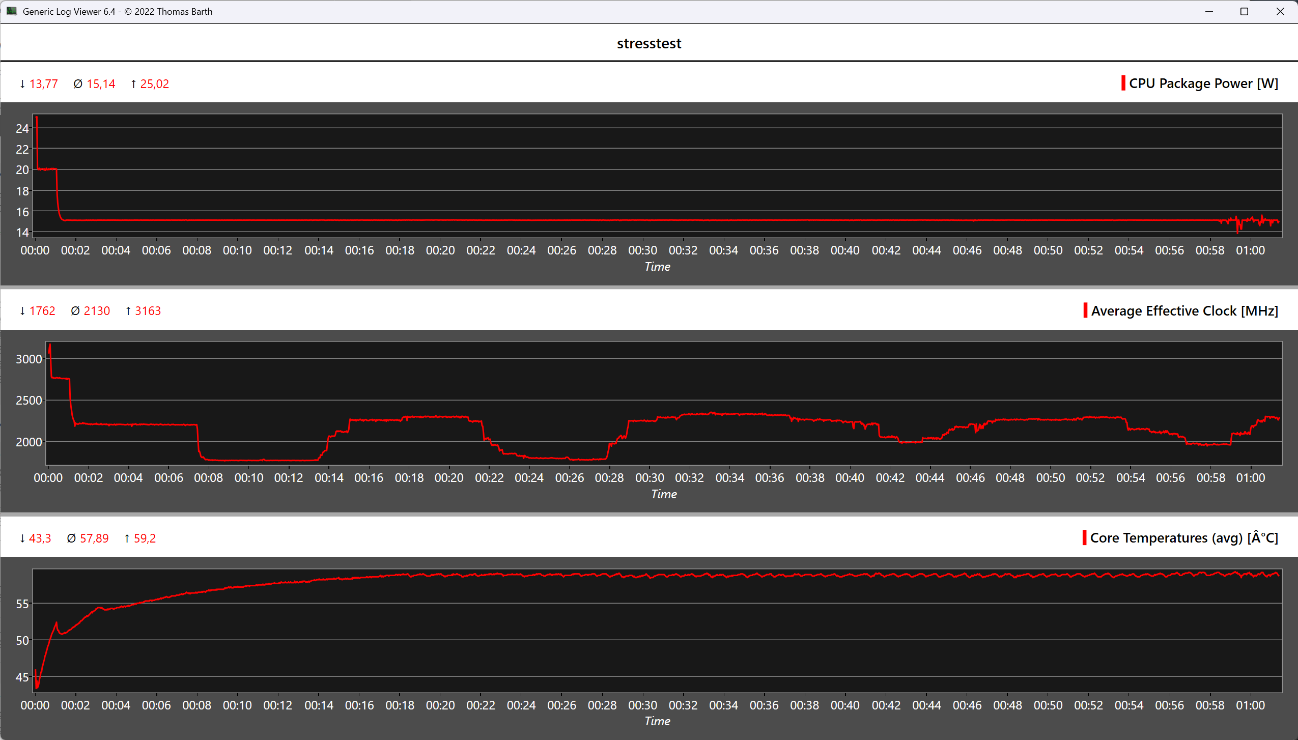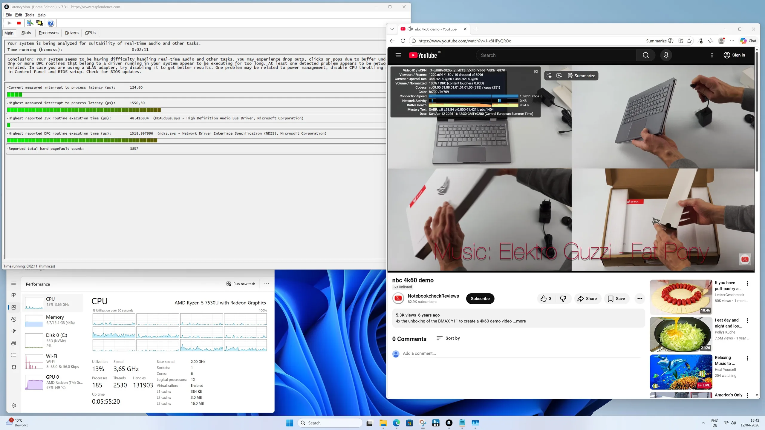 A Geekom A5 Pro burkolata kellemesen hűvös marad mind üresjáratban, mind terhelés alatt, észrevehető forró pontok nélkül. A terheléses teszt során a beépített Ryzen processzor hőmérséklete rövid időre mindössze 60 °C-ra emelkedik, de nem kritikus tartományban marad. A mindössze 15 wattos TDP-t a hűtőrendszer megbízhatóan elvezeti, így stabil teljesítményt biztosít.