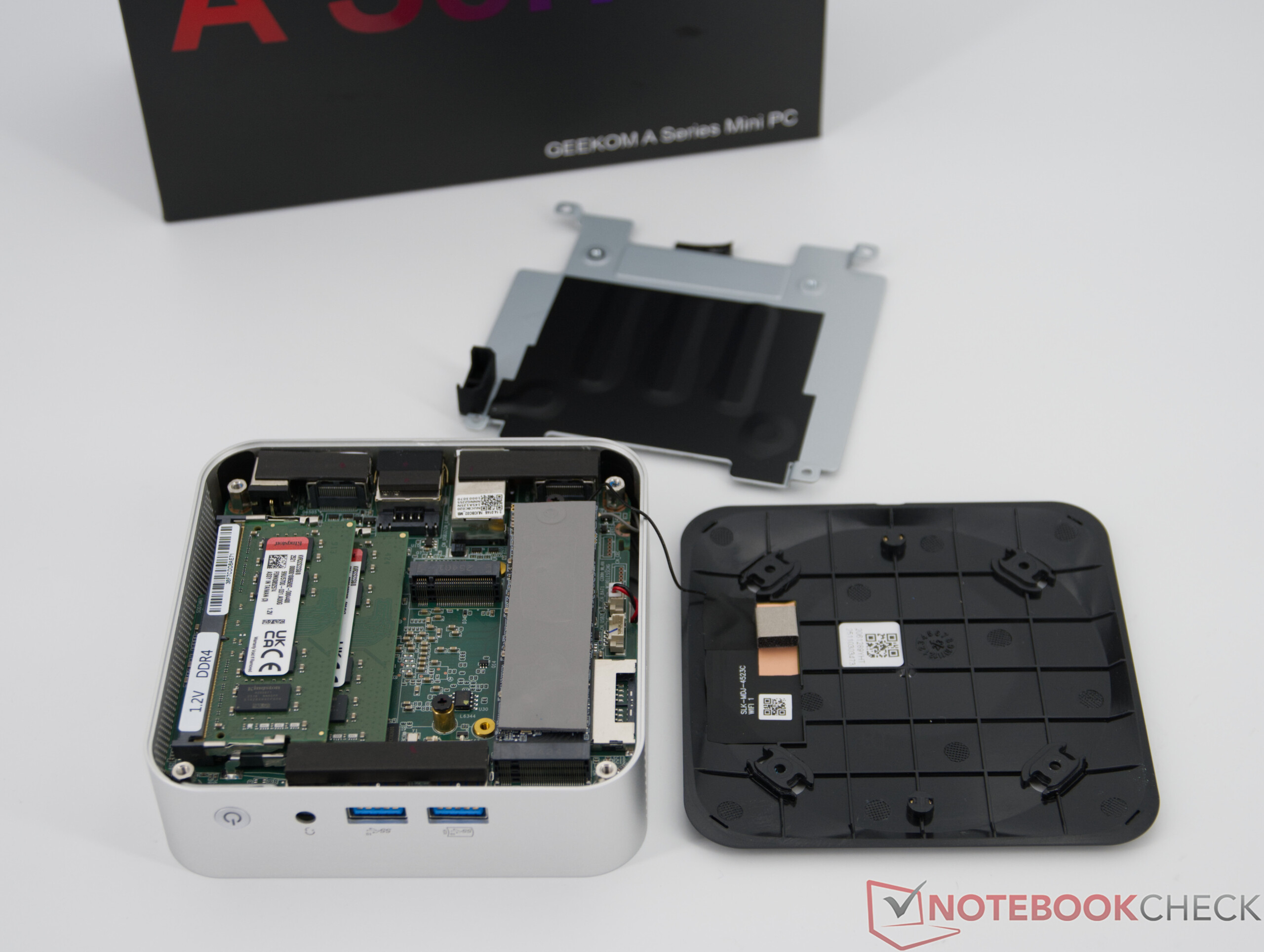 A Geekom A5 Pro-t gyárilag RAM-mal és SSD-vel felszerelve szállítják, így azonnal használatra kész. A frissítés elvileg lehetséges, de némi kézügyességet igényel a kompakt ház kinyitásakor.