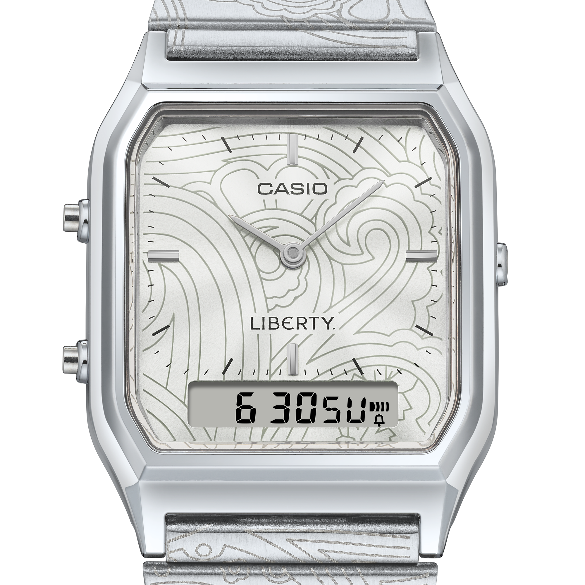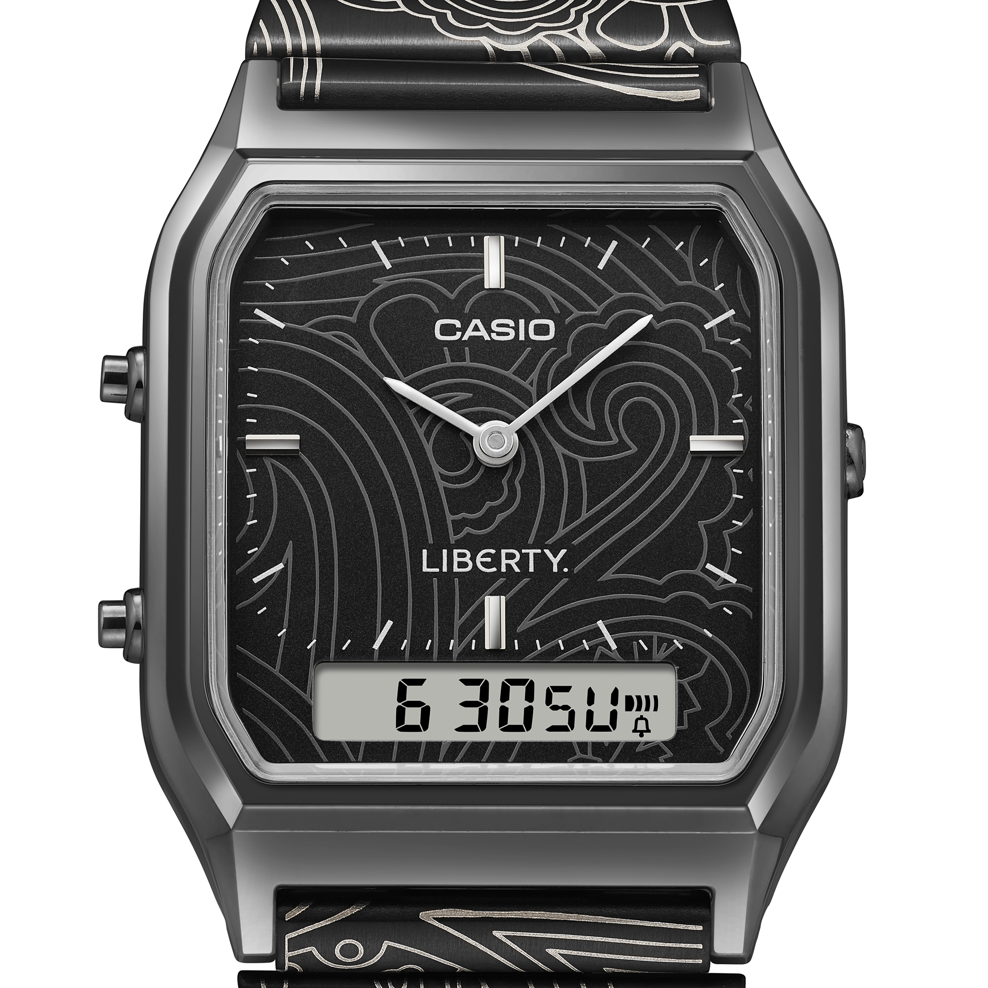 A Casio Vintage x Liberty óráin a brit márka ikonikus Paisley Fanfare nyomtatása lézergravírozottan jelenik meg a számlapon és a szíjon. Mindegyik órának 38,8 x 29,8 x 8,1 mm (~1,5 x 1,2 x 0,3 hüvelyk) méretű, bevonatos műgyanta háza van, és rozsdamentes acél szíjjal érkezik. Körülbelül három évig kell működniük az elemmel, és vízállónak is forgalmazzák őket.