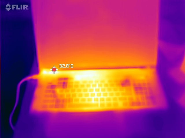 Terhelés alatt 40 °C körüli forró pontokat mértünk, különösen az alsó oldalon és a központi zsanér közelében.