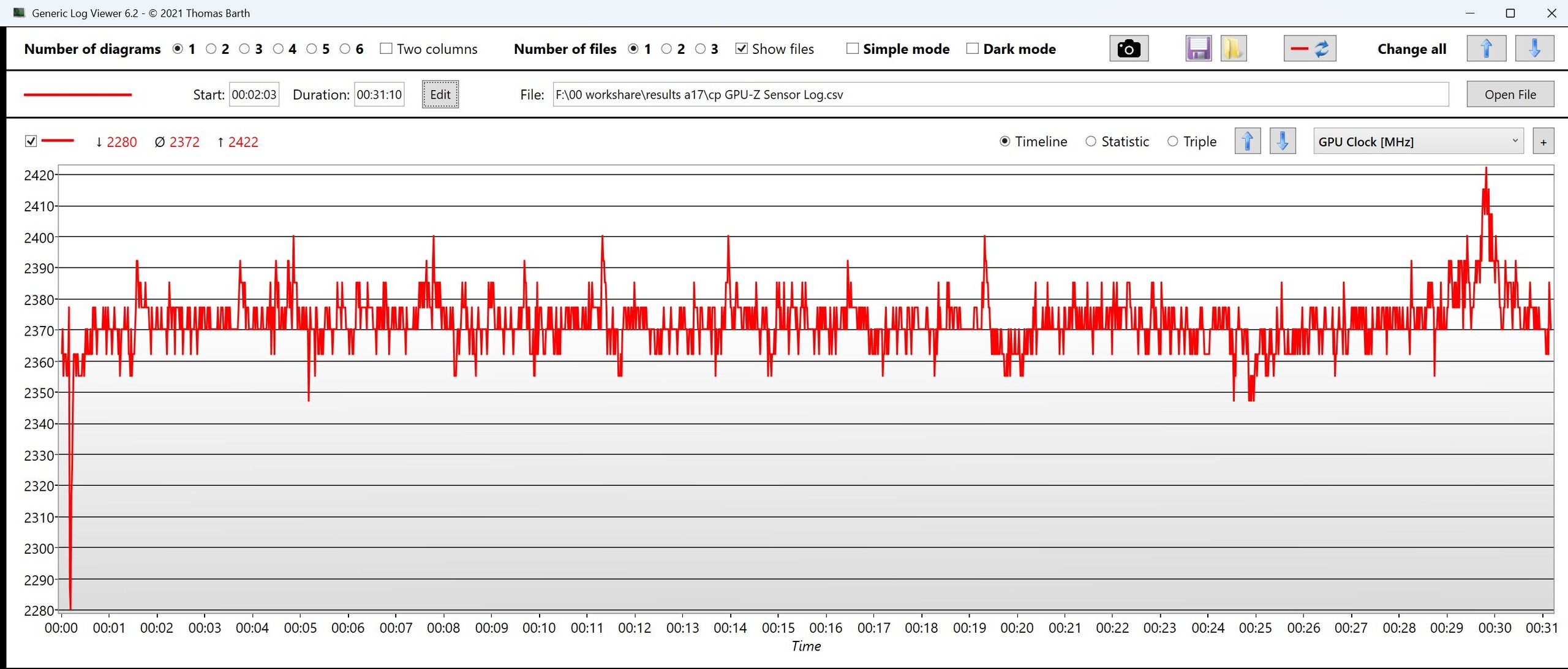 | CPU órajel (GHz) | GPU órajel (MHz) | CPU átlaghőmérséklet (°C) | GPU átlaghőmérséklet (°C) | |