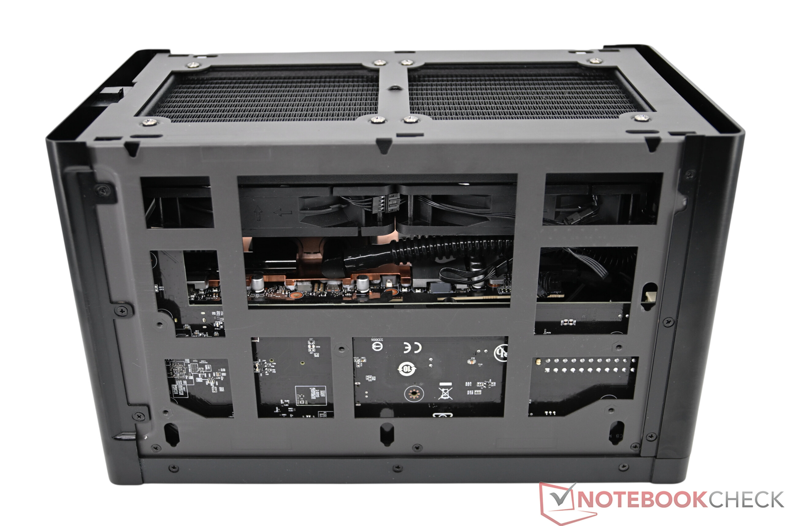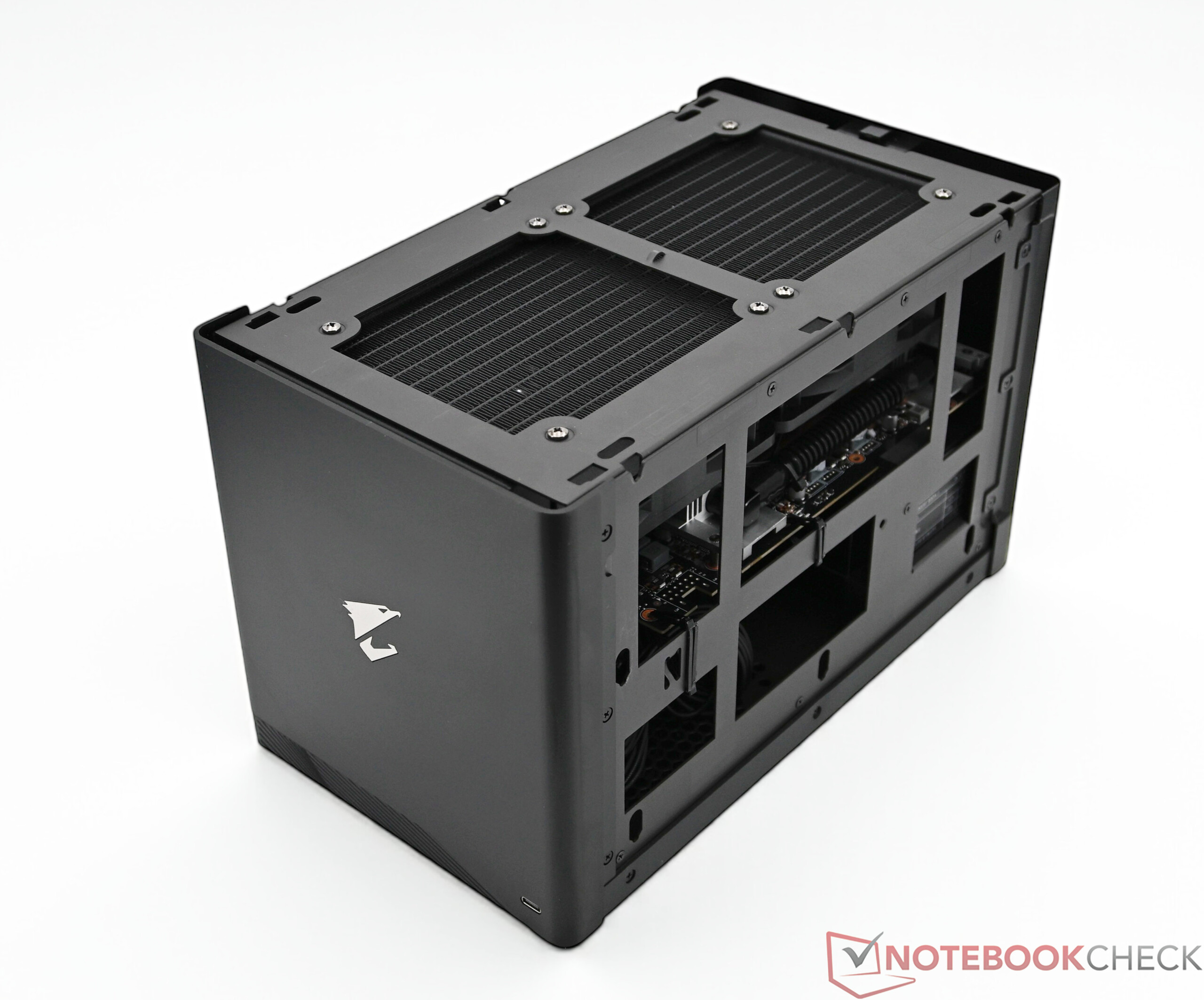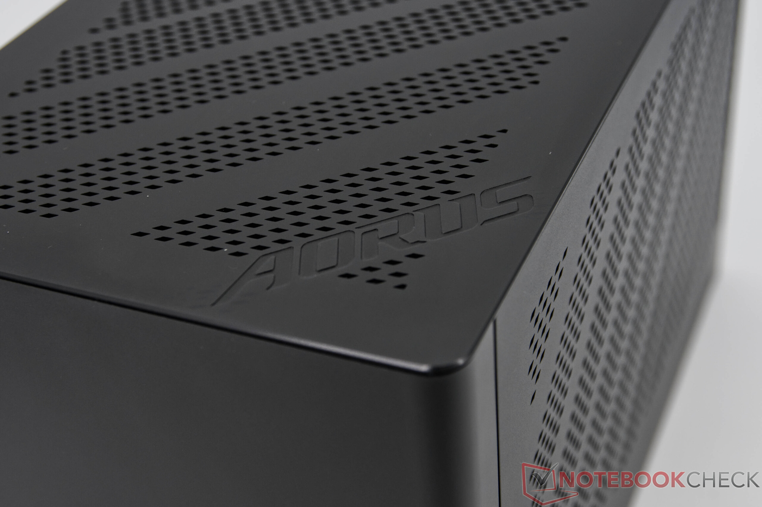 A Gigabyte a GeForce RTX 5090-et az Aorus RTX 5090 AI Boxba egy nagy teljesítményű AiO hűtőrendszerrel és egy 850 wattos tápegységgel együtt egy különösen kompakt, stabil házba integrálja. Ez túlnyomórészt fémből készült, ami nagyfokú robusztusságot és kiváló minőségű megjelenést biztosít. A fedél és az oldalsó panelek szerszám nélkül eltávolíthatók, utóbbiak pedig porszűrőkkel is fel vannak szerelve, amelyek zárt állapotban is könnyen kihúzhatók hátrafelé. A ház és a beszerelt alkatrészek szükség esetén tovább szétszerelhetők. A kivitelezés tekintetében aligha lehet kritikát megfogalmazni. Vizuálisan a dobozt diszkréten kiemeli az előlapon található, megvilágított AORUS logó, amelynek hatása a Gigabyte Control Center segítségével állítható, vagy igény esetén teljesen kikapcsolható. Egyetlen hátránya, hogy a fémfelületeken hamar megjelennek az ujjlenyomatok.