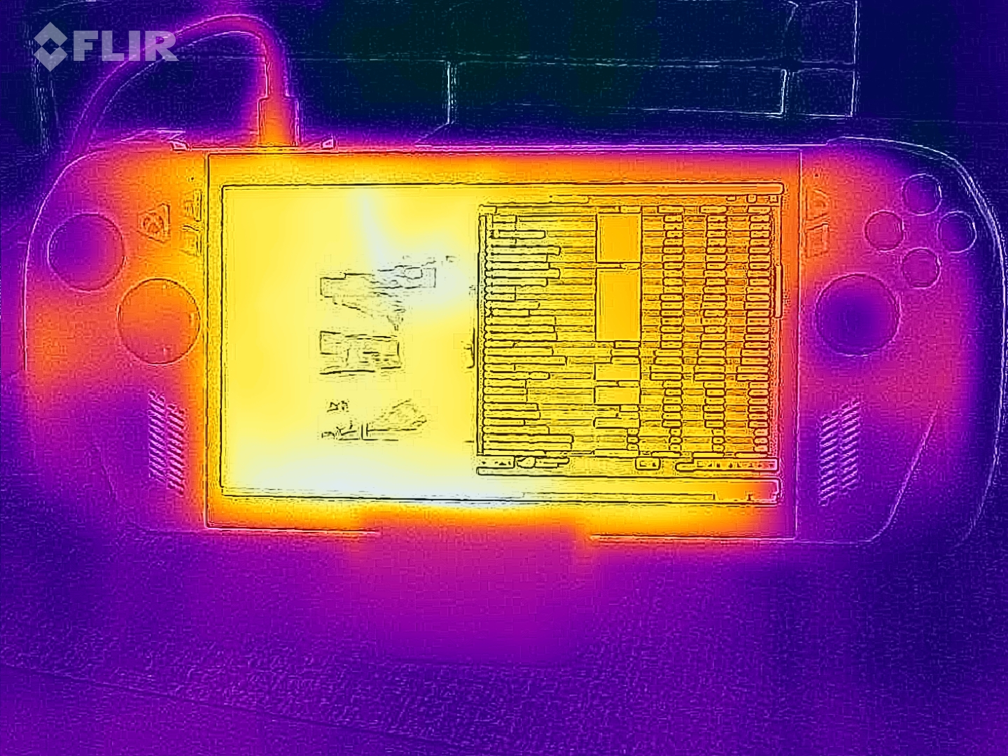(+) A felső oldalon a maximális hőmérséklet 39.6 °C / 103 F, összehasonlítva a 37.9 °C / 100 F átlagával , 26.6 és 55 °C között a Handheld / UMPC osztálynál.