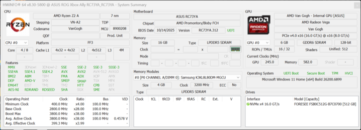 A Ryzen Z2 A a régebbi Zen 2 architektúrán alapul, és 16 GB RAM-mal párosul az Xbox Allyban. Tesztkészülékünkön ebből a memóriából 6 GB-ot alapértelmezés szerint az integrált RDNA 2 GPU-hoz rendeltek, bár ez az Armoury Crate SE szoftverben módosítható.