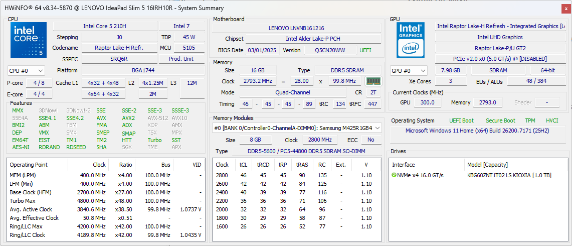 | Lenovo Ideapad Slim 5 16IRH10R Intel Core 5 210H ⎘ Intel UHD Graphics Xe G4 48EUs ⎘ 16 GB Memória | Amazon: $749.99 List Price: 850 USD | 1.9 kg | 18.4 mm | 16.00" 1920x1200 142 PPI IPS | |