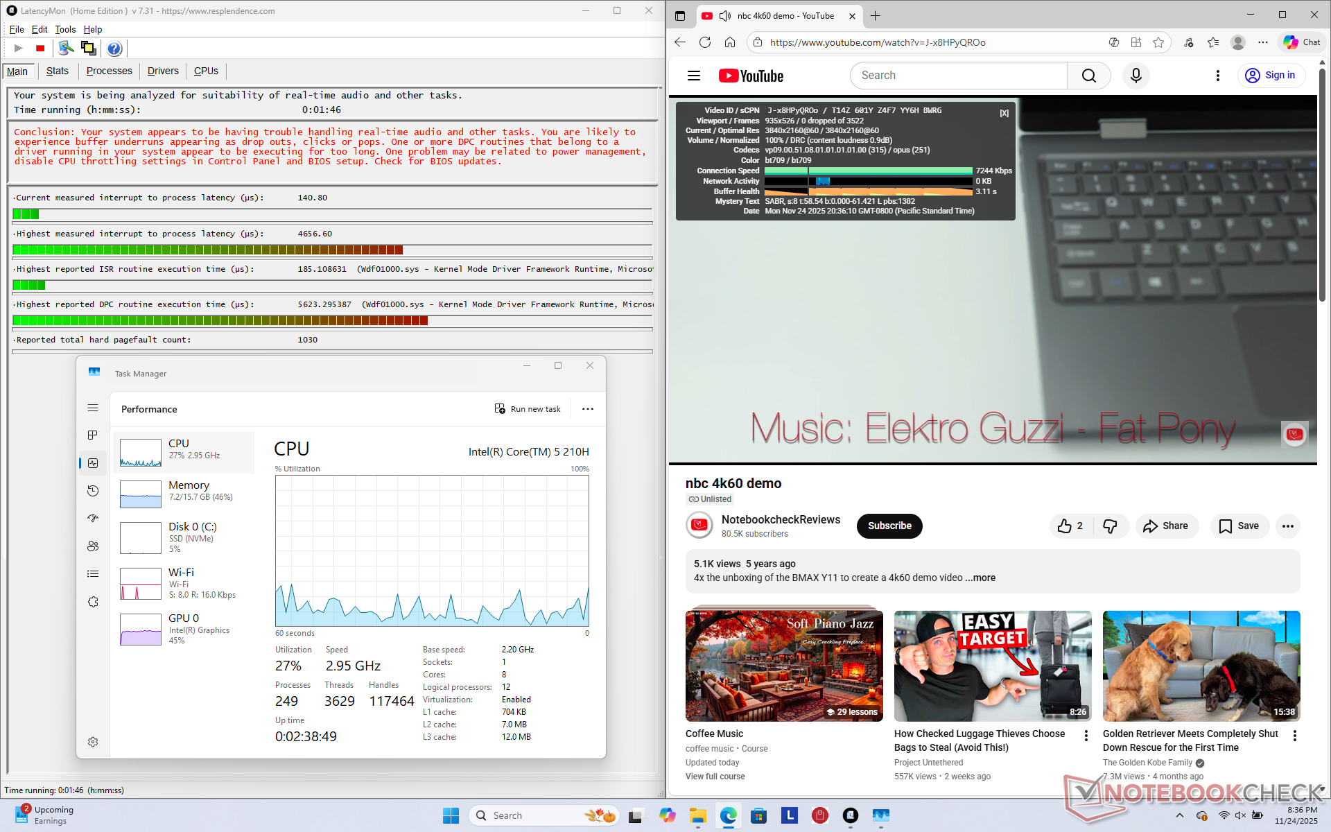 A 2025 Lenovo Ideapad Slim 5 16 kétféle változatban kapható: AMD vagy Intel. Miután teszteltük mind a Ryzen AI 5 330 és a Core 5 210H konfigurációkat, nyugodtan kijelenthetjük, hogy az Intel változat címtől függően akár 50 százalékkal gyorsabb többszálú teljesítményt és 10-30 százalékkal gyorsabb játékteljesítményt nyújt, mint az AMD változat. Az energiafogyasztás igényes terhelések futtatásakor összességében magasabb, így a teljesítmény wattonként nem feltétlenül jobb, de a WLAN-akkumulátoros üzemidő egyébként eléggé hasonló a kettő között.
