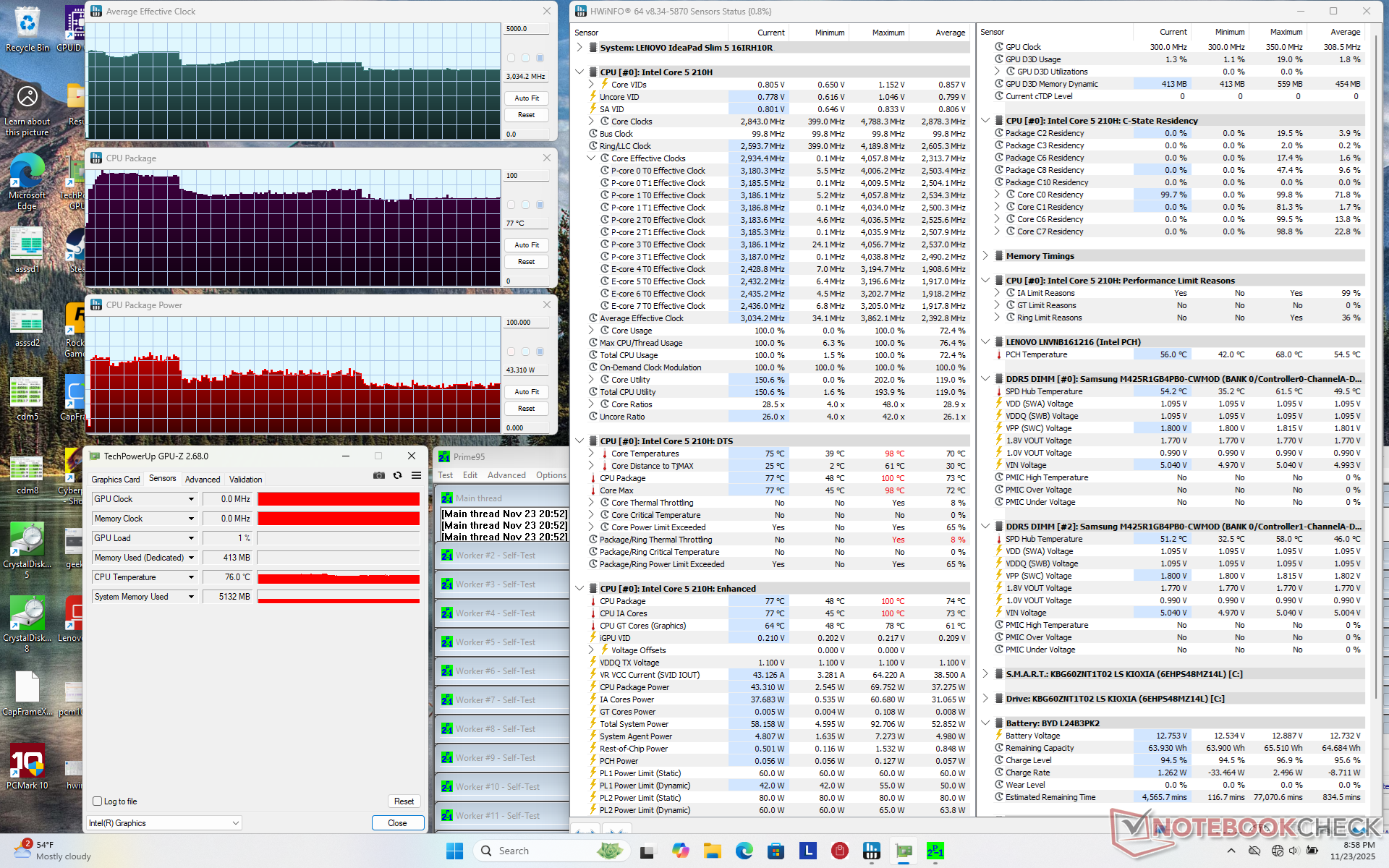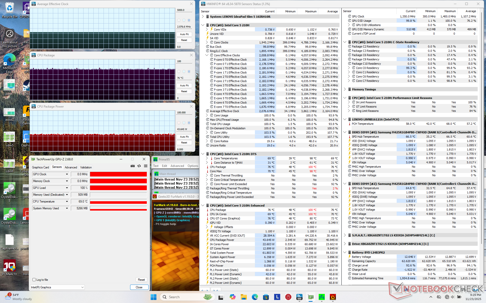 | Prime95 + FurMark Stressz | 2.1 | 1350 | 76 |