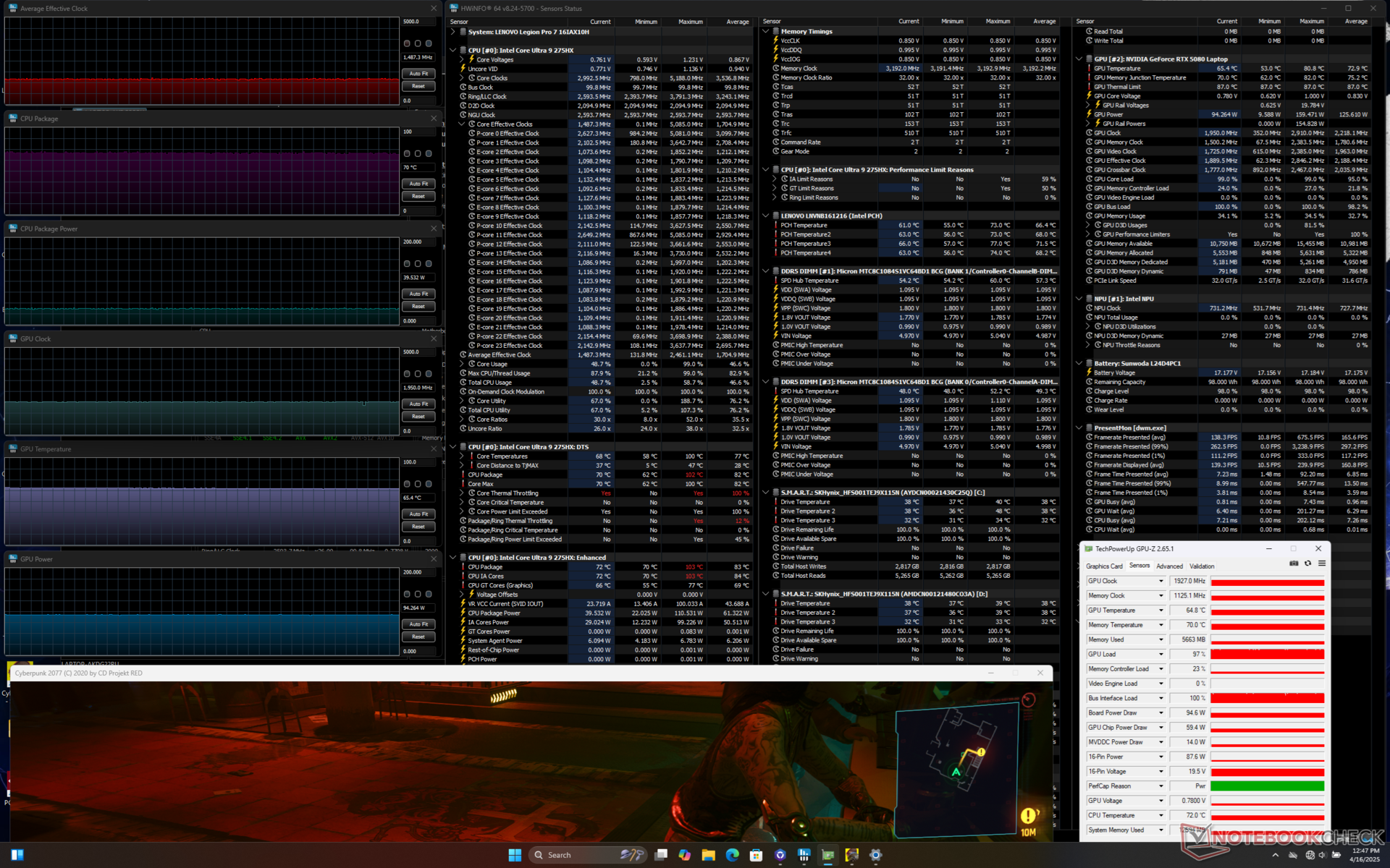 A Prime95 futtatása körülbelül 222 W-ot fogyaszt, míg az AMD-vel hajtott Razer Blade 16 csak 98 W-ot. Más szóval, az Intel rendszerünk több mint 2,2x nagyobb igénybevételt jelent a Razerhez képest, miközben 1,5x nagyobb többszálú teljesítményt nyújt, általában alacsonyabb teljesítmény/watt mellett. Ez a nagy különbség folytatódik olyan játékok futtatásakor is, mint a Cyberpunk 2077 , ahol a Lenovo körülbelül 320 W-ot fogyaszt, míg a fent említett Razer csak 178 W-ot.