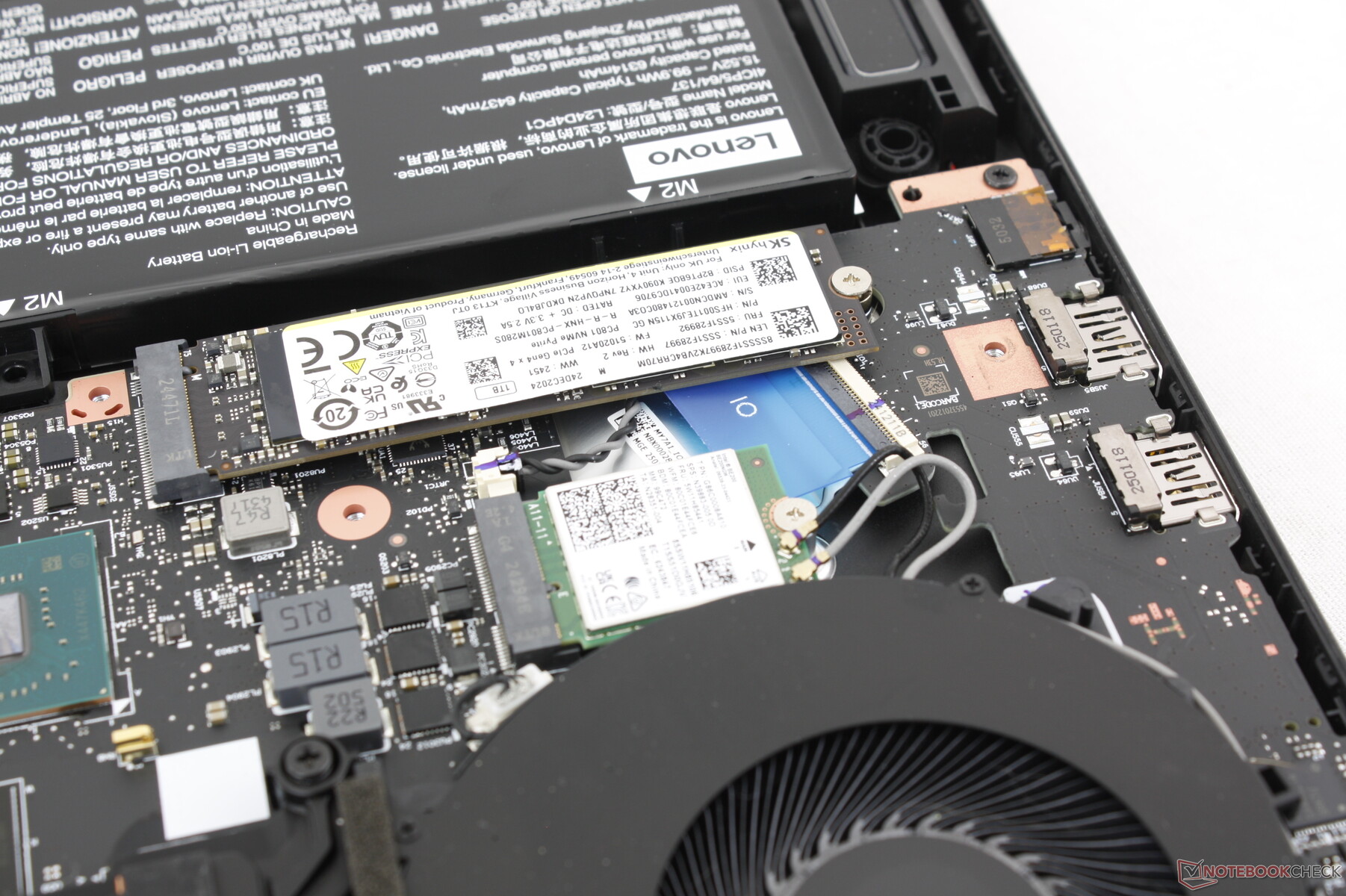 A szervizelés a szokásosnál kissé bonyolultabb. A legtöbb más laptopoktól eltérően a két SODIMM-helyet, a két M.2 SSD-helyet és a WLAN-modult a külső borításon kívül egy nagy alumíniumlemez is takarja, ahogy az alább látható. A készülék egyszerűen eltávolítható, amennyiben a felhasználók óvatosak, hogy ne szakítsák el a harmadik ventilátort az alaplaphoz csatlakoztató szalagkábelt.