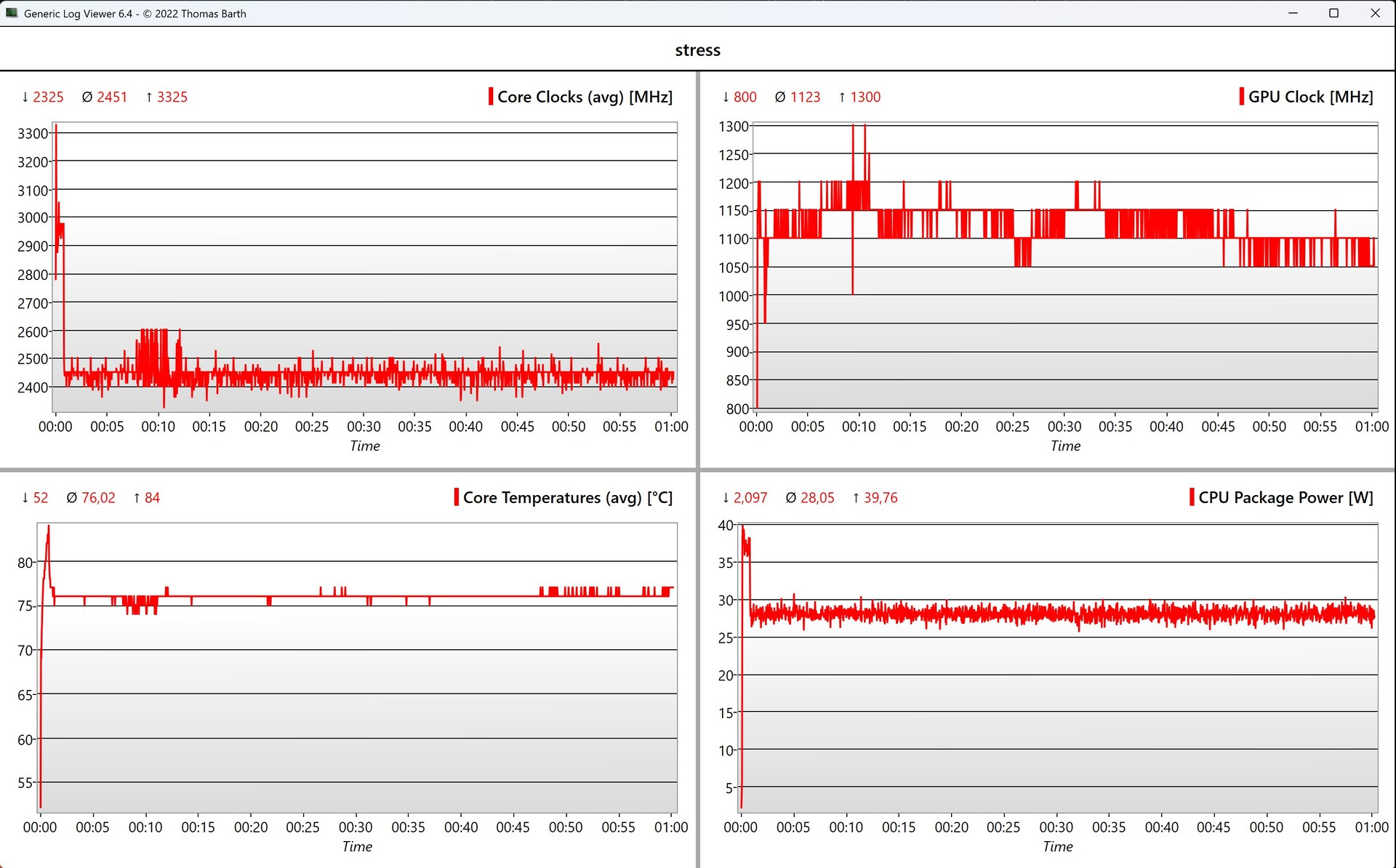 A Hold-tó-alapú Core Ultra 5 228V 32 GB LPDDR5x-8533 RAM-mal és 8 magos kialakítással (4 Performance mag és 4 Efficiency mag) rendelkezik. Az energiafogyasztás rövid időre 37 wattos csúcsot érhet el, mielőtt tartós terhelés mellett 28 watton állapodna meg, ami megegyezik az Arrow Lake modellel. A Core Ultra 5 228V azonban érezhetően alacsonyabb többmagos teljesítményt és csökkentett egymagos teljesítményt nyújt. Bár itt egy Core Ultra 7-et hasonlítunk össze egy Core Ultra 5-tel, mindkét konfiguráció ára hasonló, így az összehasonlítás helyénvaló. A teljesítmény stabil marad akkumulátoros üzemmódban.